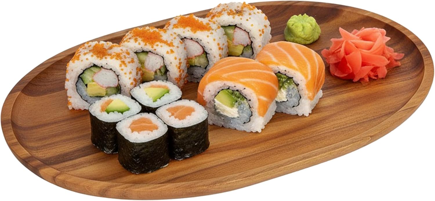 - SIZE: Our 8"W x 12"L, natural acacia wood, medium oval tray is perfect for all of your entertaining and serving needs. Whether you are having a party at home of if you are a restaurant. Smaller, larger sizes and different finishes are available.