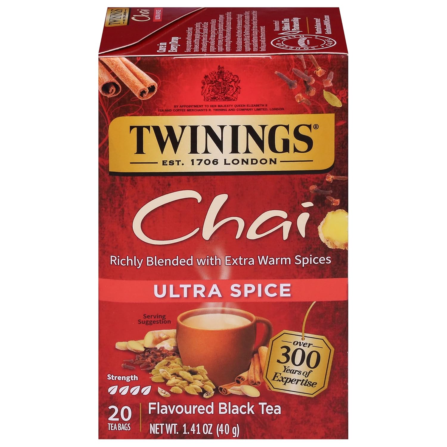 Twinings Chai Tea, Ultra Spice Chai Tea Bags with Cinnamon, Ginger, Cardamon, Clove for a Spicy Chai Tea Latte, 20 Tea Bags