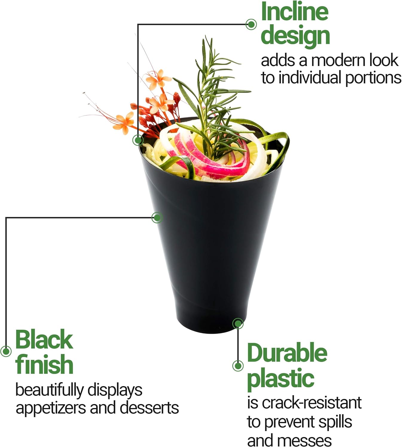 Restaurantware 7 Ounce Plastic Glasses 100 Round Incline Shooter Cups- Disposable Sturdy Black Plastic Round Bowls Unique Design For Soups Appetizers Or Desserts