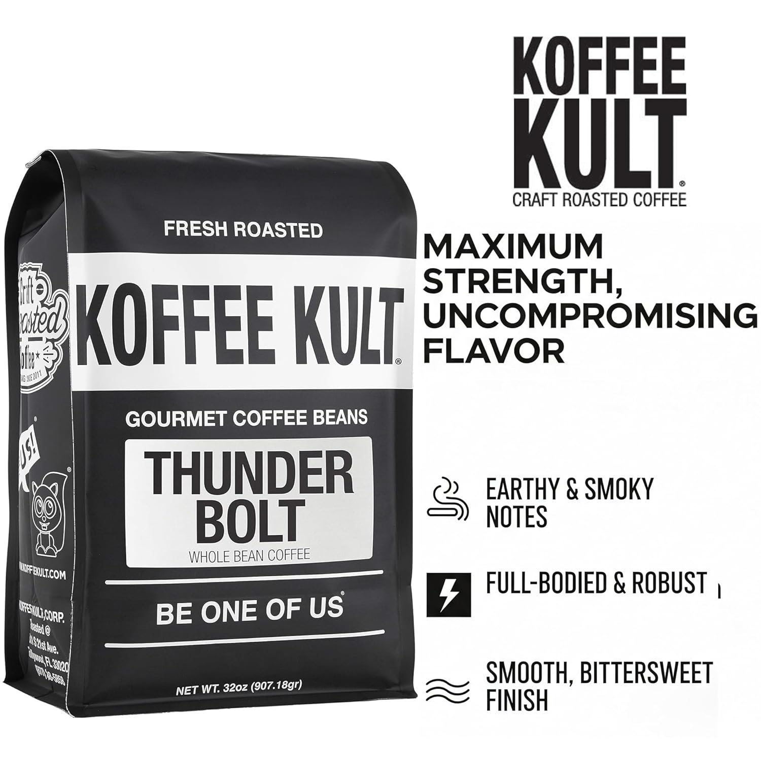 Koffee Kult Thunder Bolt Dark French Roast Whole Bean Coffee - Small Batch 100% Arabica Gourmet Blend, Bold and Well Balanced 32oz Resealable Package