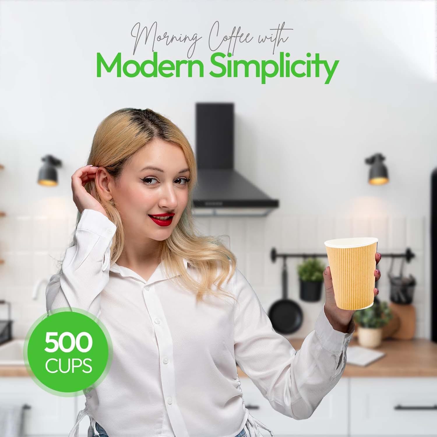 500-CT Disposable Kraft 12-OZ Hot Beverage Cups with Ripple Wall Design: No Need for Sleeves - Perfect for Cafes - Eco-Friendly Recyclable Paper - Insulated - Wholesale Takeout Coffee Cup