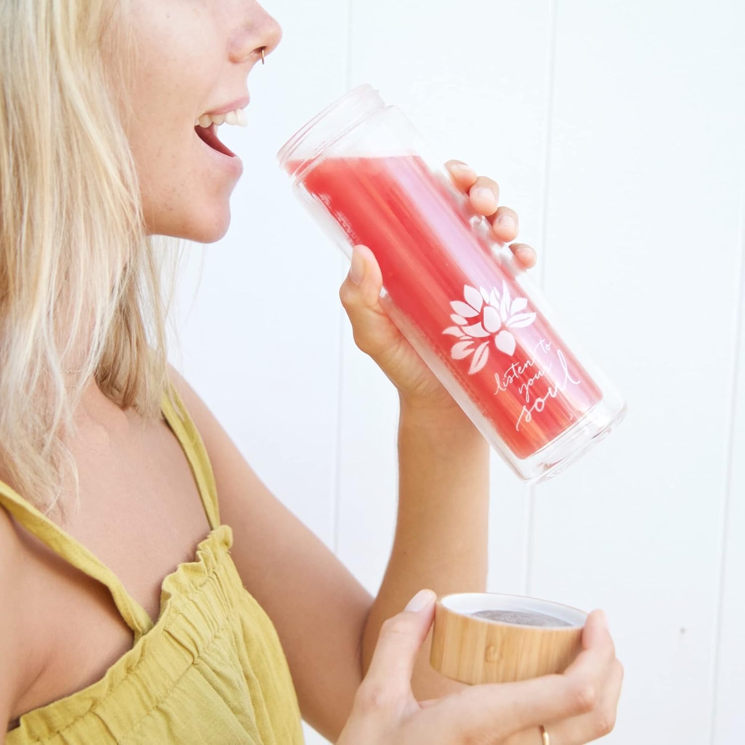 Sacred Lotus Love Double-Walled Glass Tea Tumbler with Infuser and Strainer 15oz - Perfect for Loose Leaf Tea, Cold or Hot Water Bottle, Fruit Drinks - Comes with Travel Sleeve and Cozy