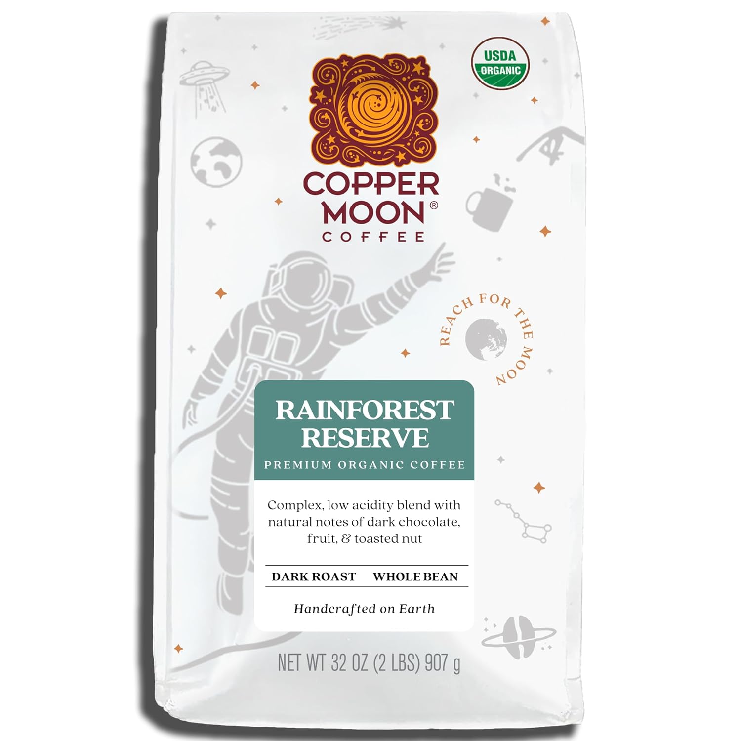 - PREMIUM COFFEE BLEND: Copper Moon Rainforest Reserve Premium Organic Coffee is a smooth yet bold blend, luscious and complex as its biodiverse South American namesake. Cultivated in rich volcanic soil, carefully hand picked and slowly dark roasted to deliver the peak natural flavors in the bean.