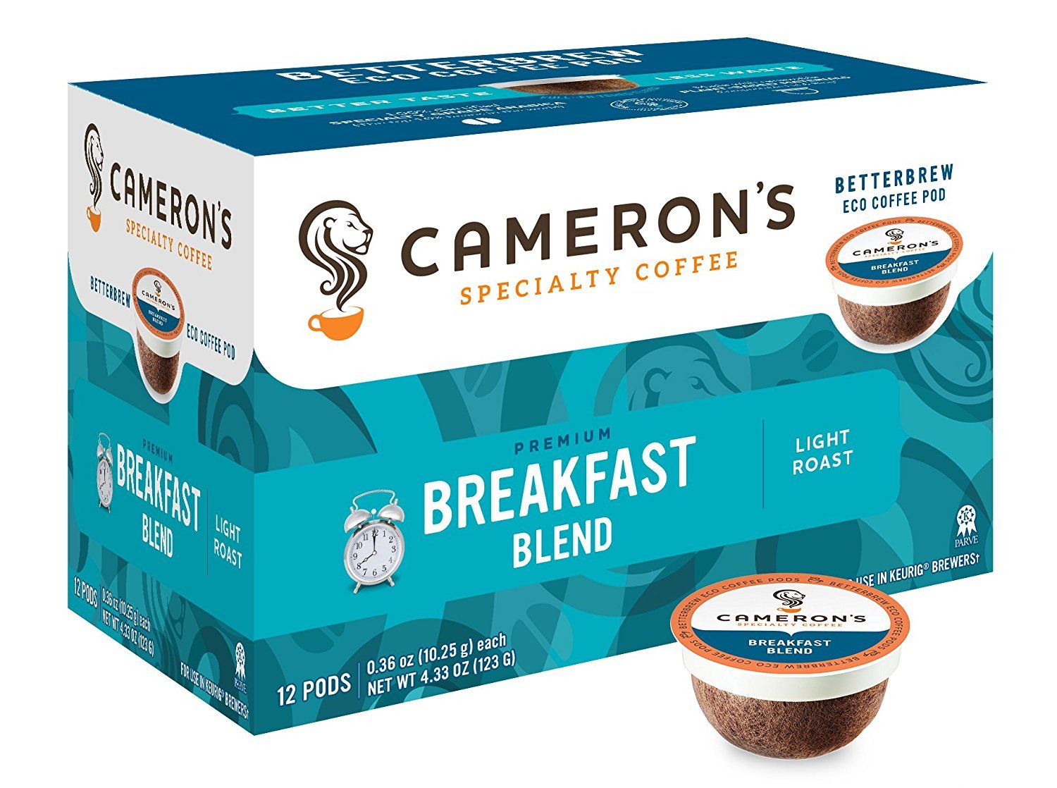 - QUICK AND EASY: One box of 72 Breakfast Blend single serve, compostable, coffee pods. Cameron's Coffee strives to provide the convenience of a single serve pod with the quality of café brewed coffee.