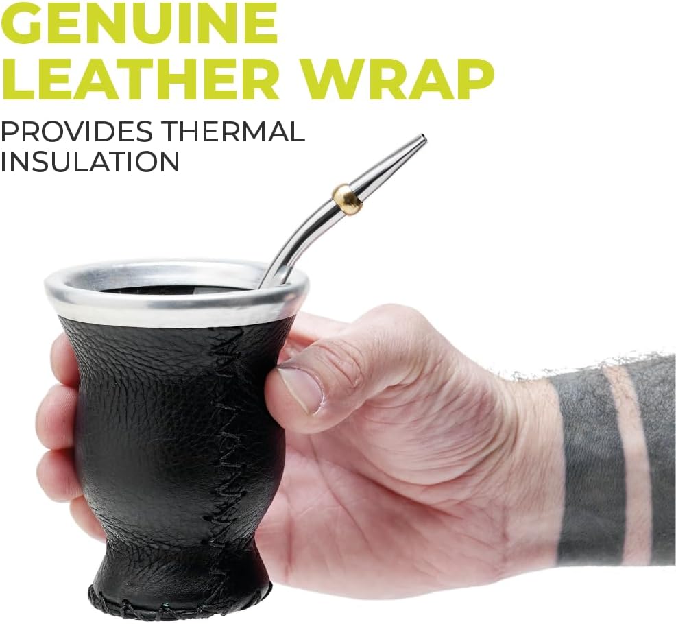 - THE SET - This mate set includes one glass mate cup wrapped in real leather with an aluminum ring on its top and one bombilla (straw).