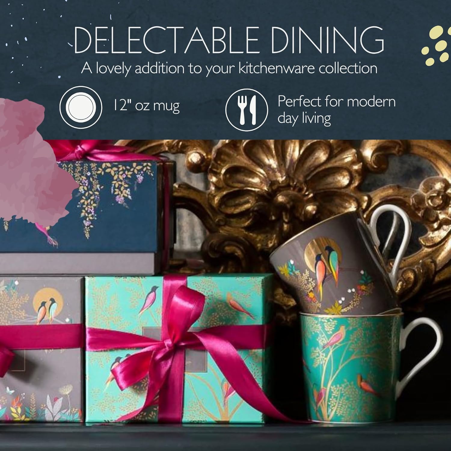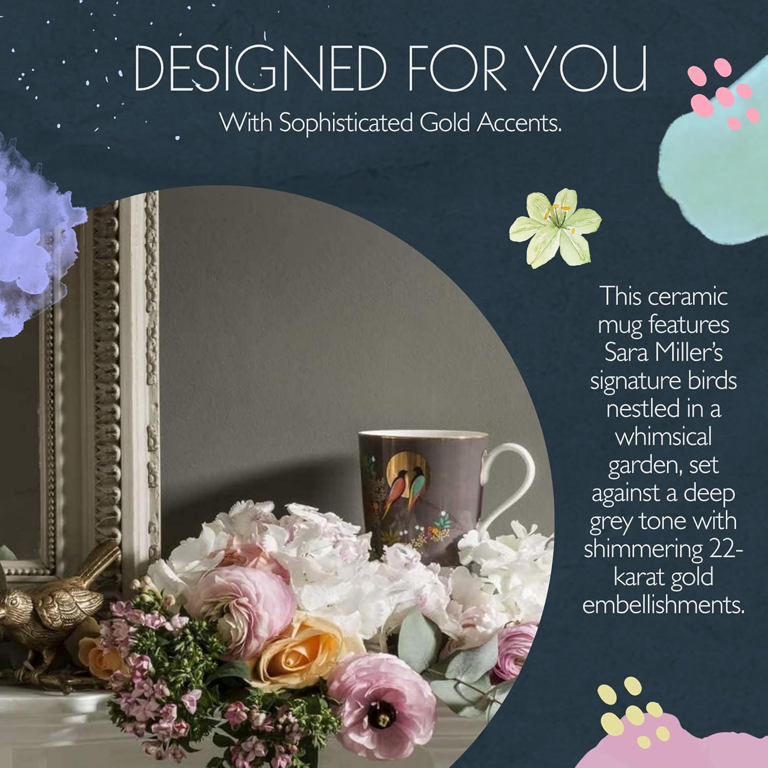 - Dreamlike Design Aesthetic: This ceramic mug features Sara Miller’s signature birds nestled in a whimsical garden, set against a deep grey tone with shimmering 22-karat gold embellishments.