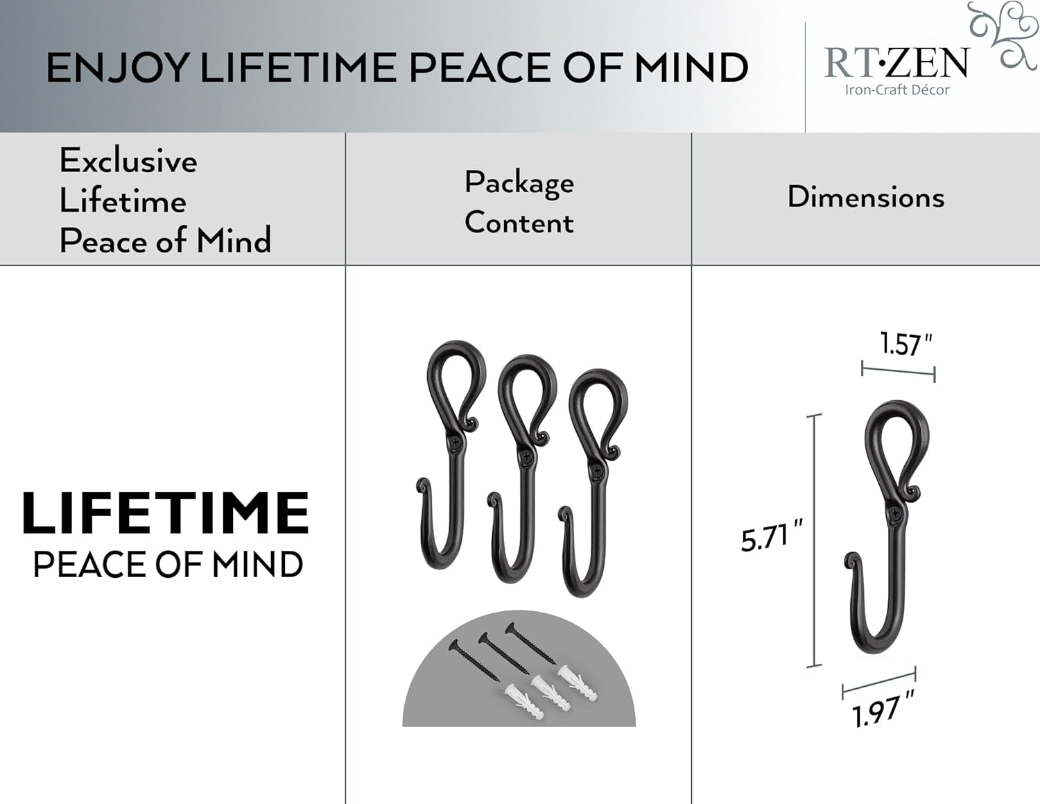 RTZEN Wall Mount Hook Set - Wrought Iron Decorative Rustic Metal Coat Hooks for Hanging - Handcrafted Classic Farmhouse Wall Mounted Black Hooks for Towel Robe or Hat Hanging - 3 Pack