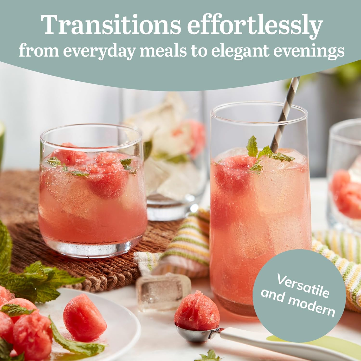 - Versatile Glass Set: The unique drinking glasses in our beverage glasses set are versatile enough to upgrade any table setting and showcase any drink imaginable, making your dinner parties the must-attend event on everyone’s weekend list