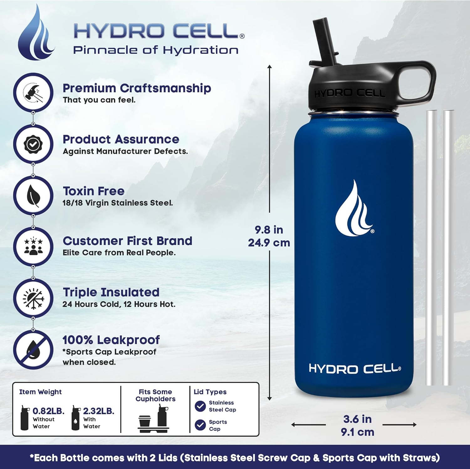 - STYLE: Purchase Includes Stainless Steel Bottle, Screw Cap (100% Airtight), Bonus Sports Cap with Straws (Cold Temp ONLY). Hydro Cell offers the largest selection of matching Paracord Handles, Bottle Boots, and Color Replacement Caps: Sold Separate, Linked Below. Customize your Hydro.