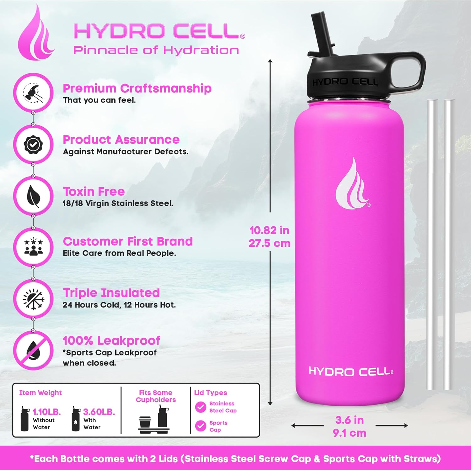HYDRO CELL Stainless Steel Insulated Water Bottle with Straw - For Cold & Hot Drinks - Metal Vacuum Flask with Screw Cap and Modern Leakproof Sport Thermos for Adults (Fuchsia 40oz)