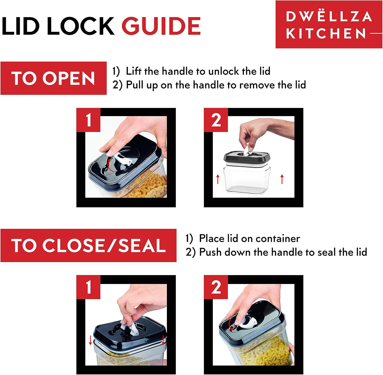 - Fresh Food: Keep your foods fresh with our kitchen essentials for new home easy to use canisters sets for the kitchen airtight lid-lock mechanism. No dealing with flimsy pumps. Our airtight containers for food storage create an airtight seal by simply pushing down the ring on the lid. Lift the ring and push up whenever you want to open the containers. The airtight seal is so secure you can store liquids without worrying about leaks!