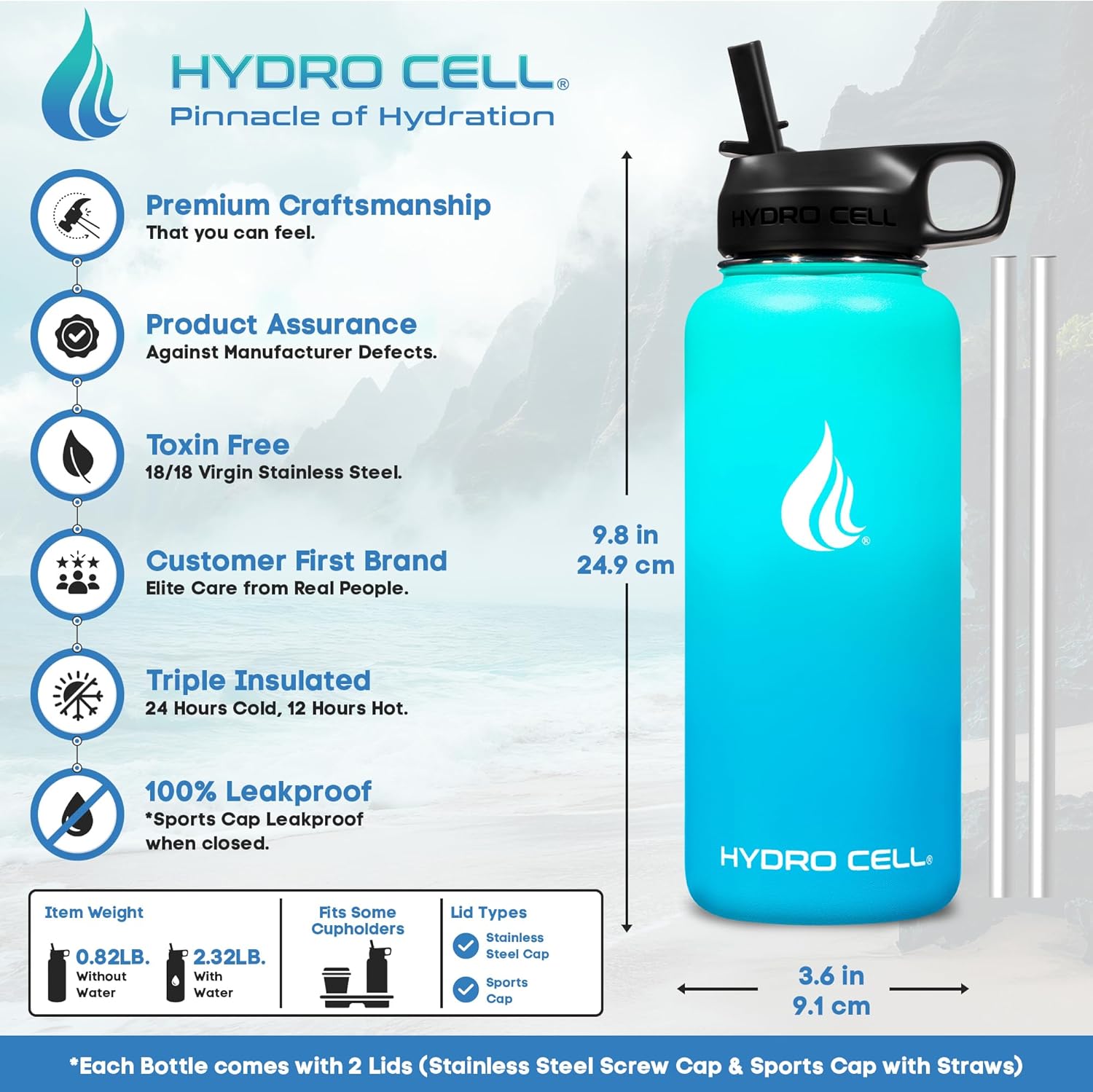 HYDRO CELL Stainless Steel Insulated Water Bottle with Straw - For Cold & Hot Drinks - Metal Vacuum Flask with Screw Cap and Modern Leakproof Sport Thermos for Adults (Teal/Blue 32oz)