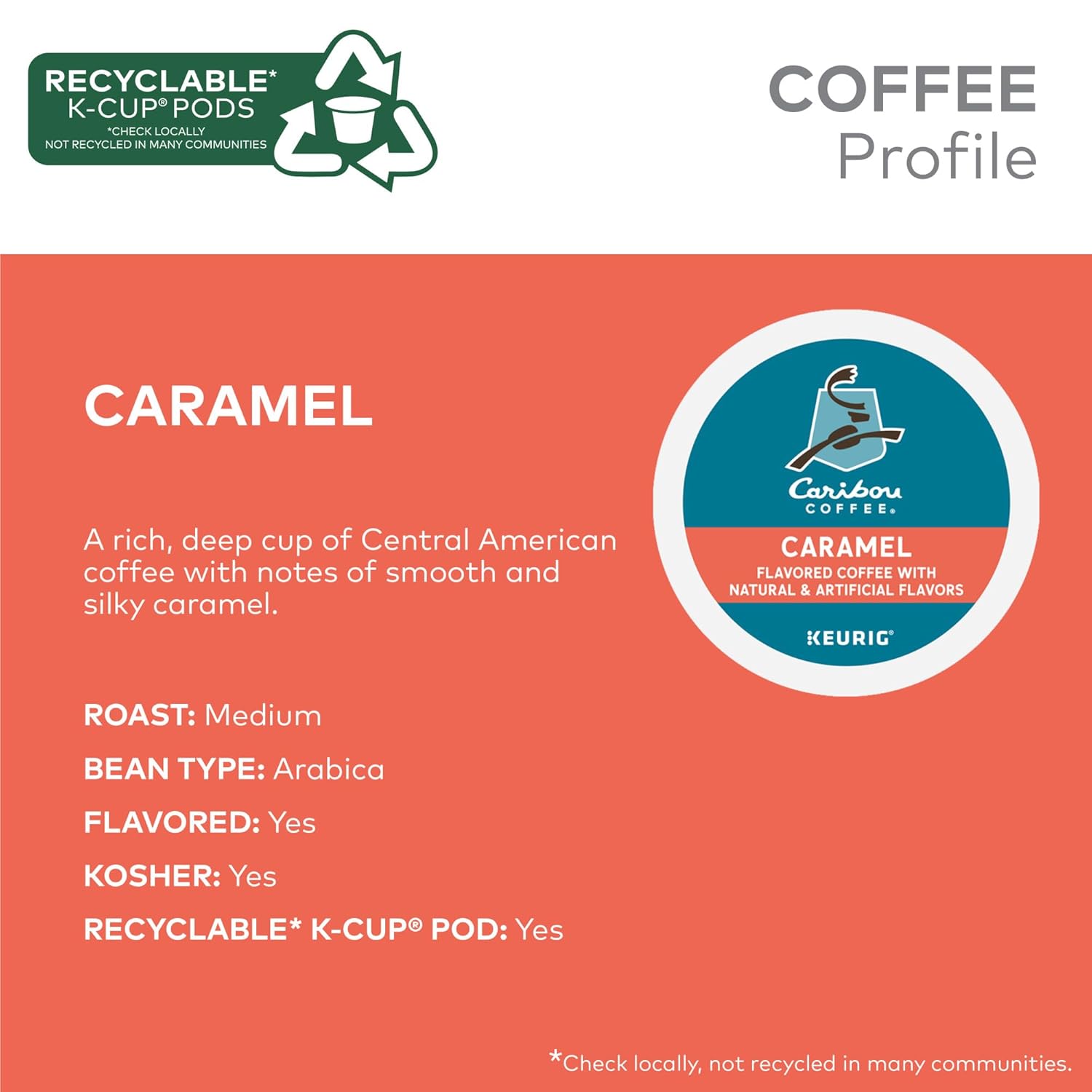 - ROAST: Caribou Coffee Caramel is a caffeinated, flavored, medium roast coffee made with specialty-grade Arabica beans.