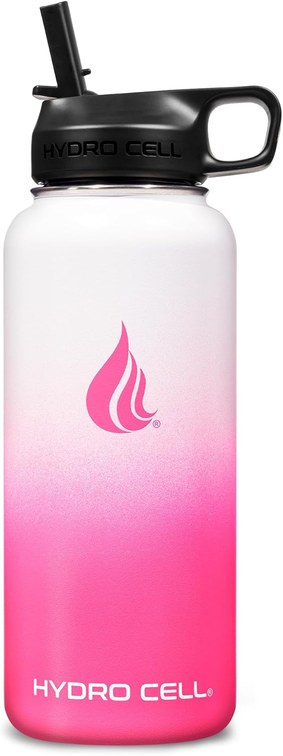 HYDRO CELL Stainless Steel Insulated Water Bottle with Straw - For Cold & Hot Drinks - Metal Vacuum Flask with Screw Cap and Modern Leakproof Sport Thermos for Adults (White/Pink 32oz)