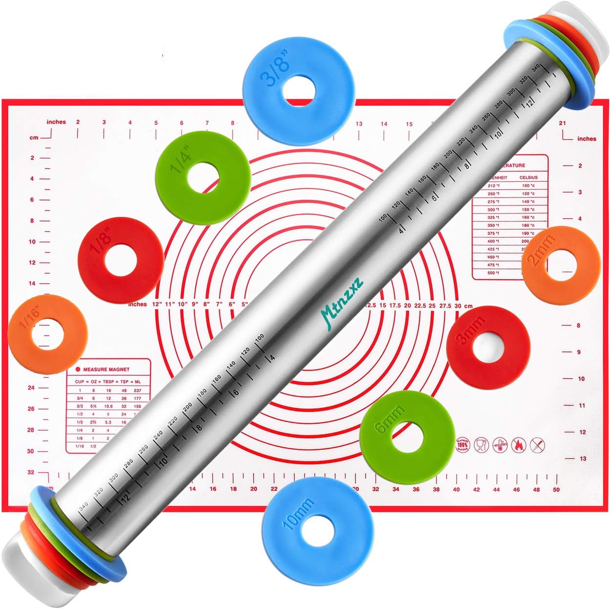 Rolling Pin and Silicone Baking Pastry Mat Set, Stainless Steel Dough Roller, Rolling Pins with Adjustable Thickness Rings, for Baking Fondant, Pizza, Pie, Pastries, Pasta, Cookies