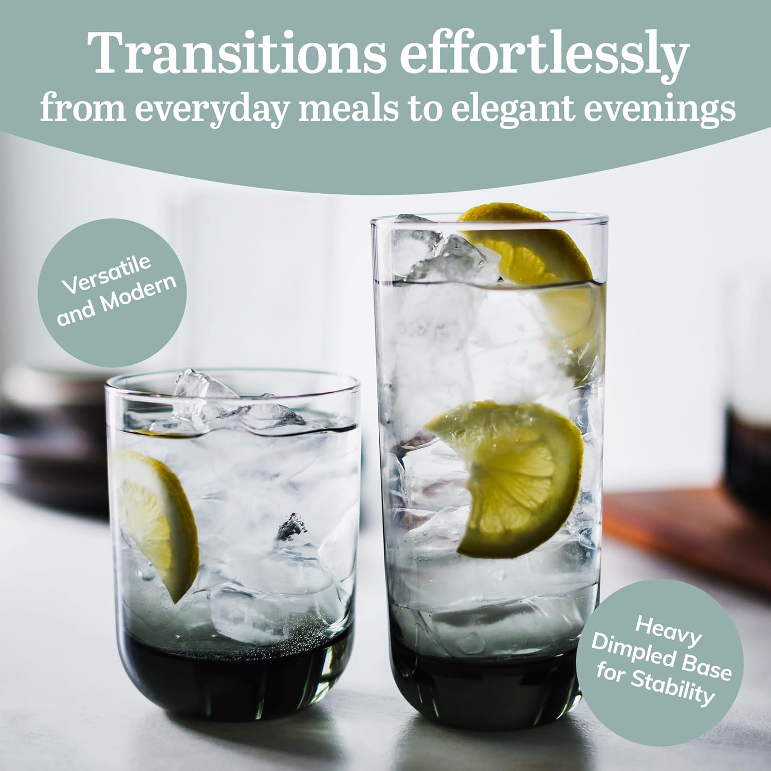 - Stable & Stylish: Polaris kitchen glasses feature a sturdy 1-inch-thick base for table stability, ergonomic grip, and a unique rounded design. This; the drink glasses set includes eight 6.3" tall tumblers and eight 4.2" tall rocks glasses