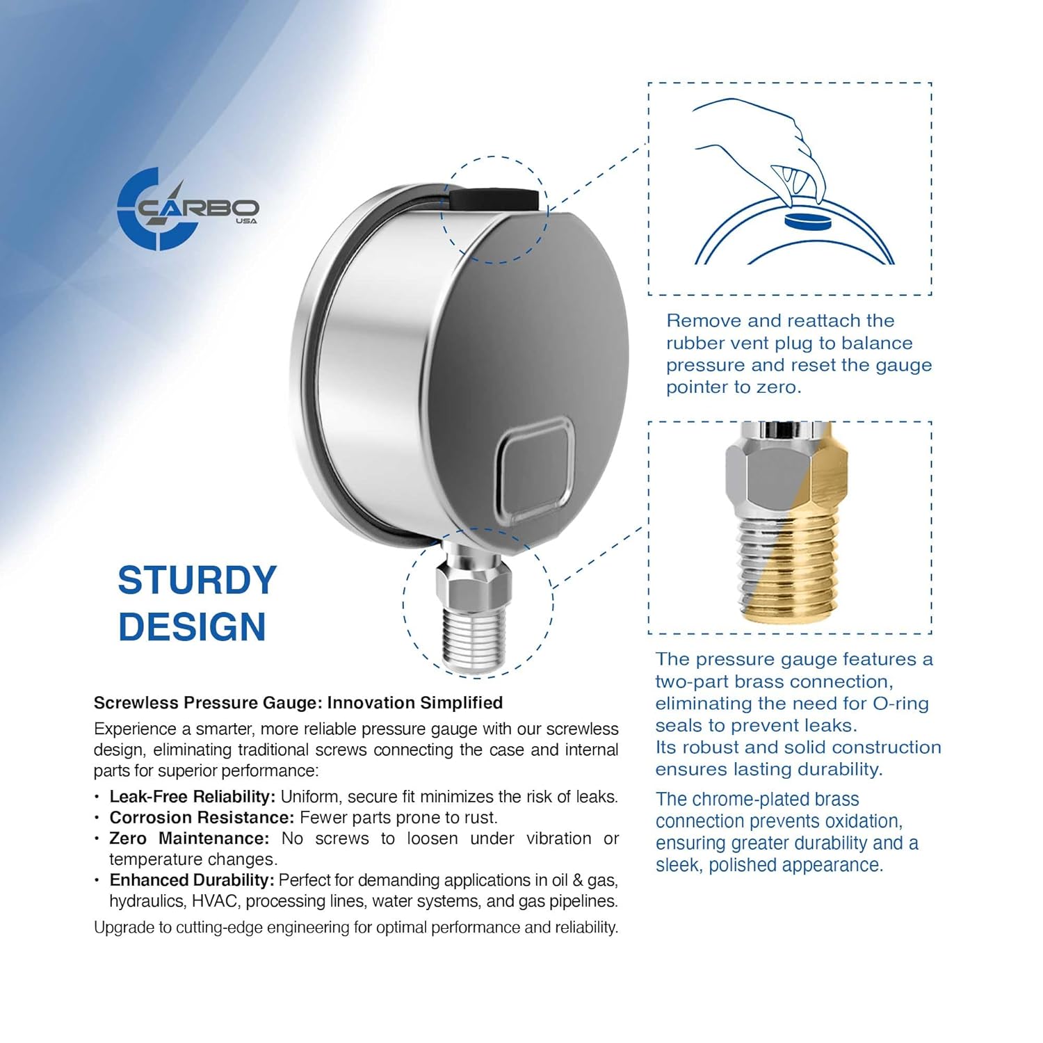 - Convenient & user-friendly: Large dial allows easy reading of pressure. The compact design of our stainless steel pressure gauge is easy to carry and portable.