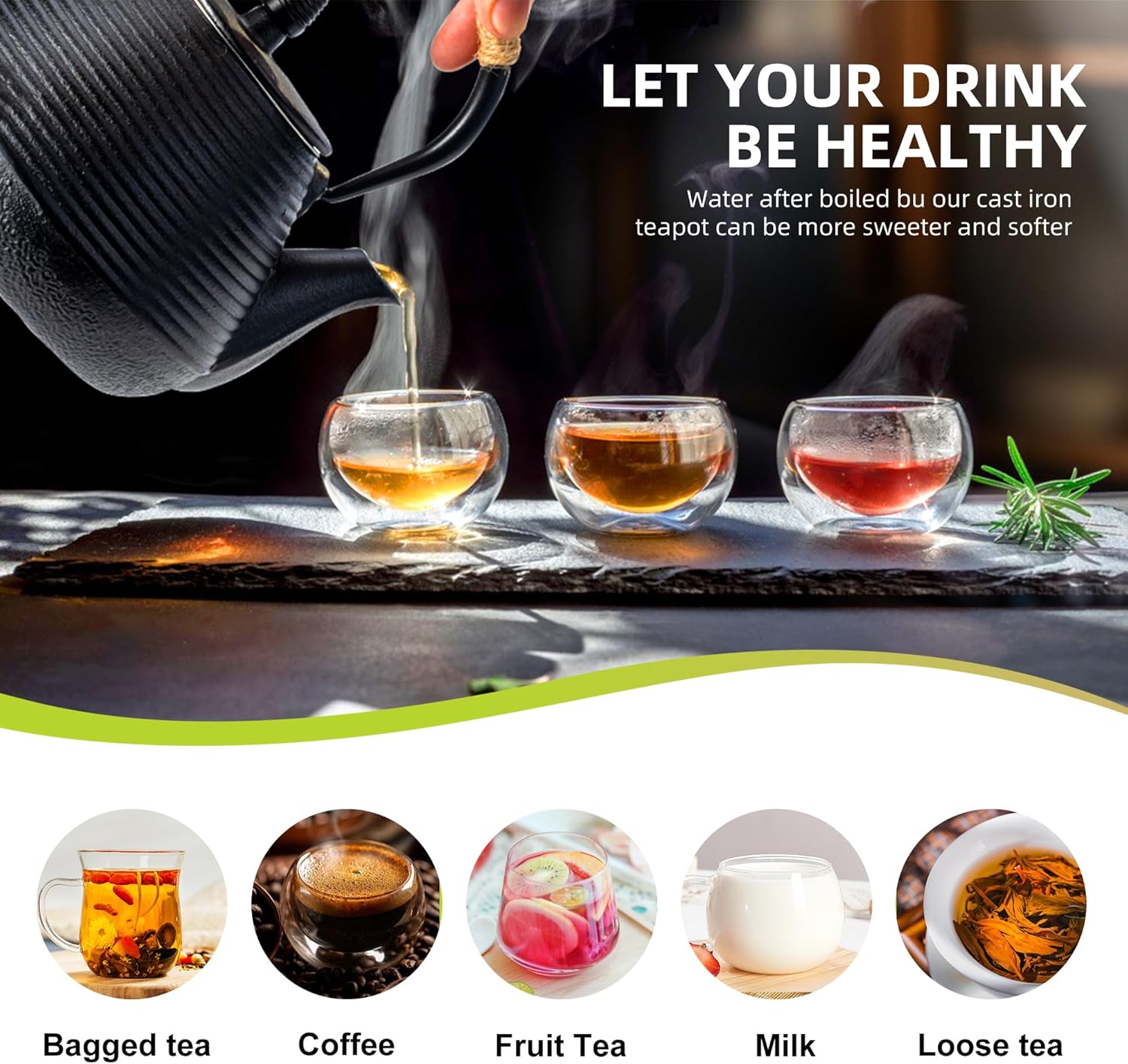 - 【GOOD FOR HEALTH】 Cast iron teapot let your drink water be healthy.Cast iron teapot can improve the water quality by releasing iron ions and absorbing chloride ions in water. So the water after boiled by our cast iron teapot can be more sweeter and softer, which is suitable for all kinds of tea making or other drinks making.
