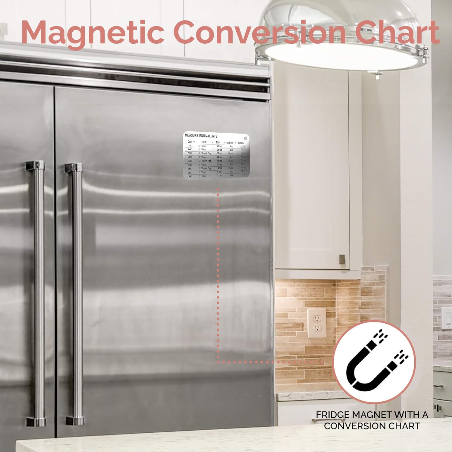 - The only set you will ever need - This versatile set of 22 pieces include: * 6 measuring cups (1/8 cup, 1/4 cup, 1/3 cup, 1/2 cup, 3/4 cup, and 1 cup) * 6 measuring spoons (1/8 tsp, 1/4 tsp, 1/2 tsp, 1 tsp; 1/2 tbsp and 1 tbsp) * 5 mini-measuring spoons (drop, smidgen, pinch, dash, and tad) * 1 cup- or spoon-leveling tool with mini-ruler * 1 fridge-magnet conversion chart * 3 round hinged rings. Whatever measurement you need, we got you covered.