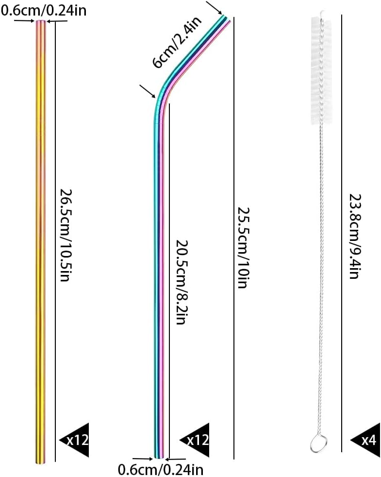 - 🍹 Super Valuable Set - 12 straight straws (0.2 in x 10.4 in), 12 bent straws (0.2 in x 10 in) and 4 extra long cleaning brushes.