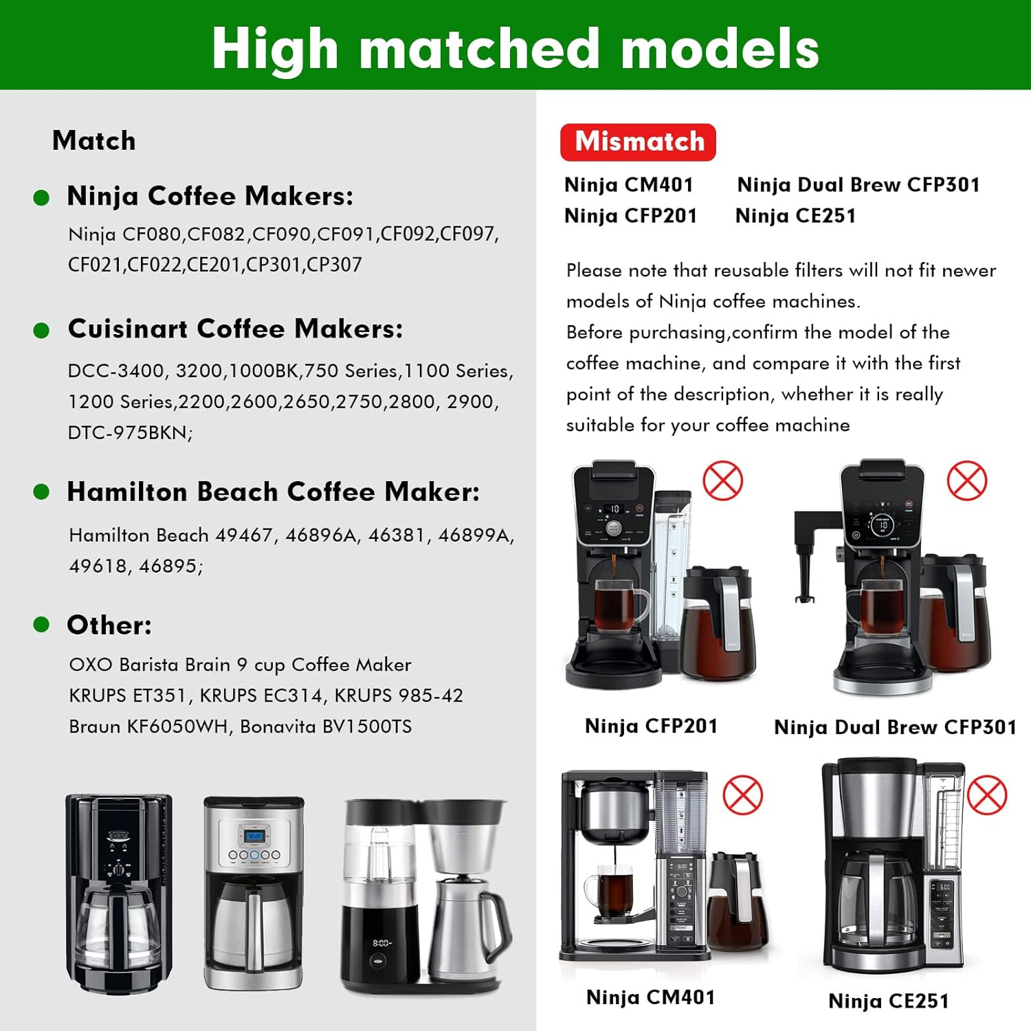 - Confirm the model of the coffee machine before purchasing : Only fit: Ninja CF080, CF082, CF090, CF091,CF092,CF097,CF021, CF022,CE201,CP307; DCC-3400, 3200,1000BK,750 Series,1100 Series,1200 Series,2200,2600,2650,2750,2800, 2900, DTC-975BKN; Hamilton Beach 49467, 46896A, 46381, 46899A, 49618, 46895;
