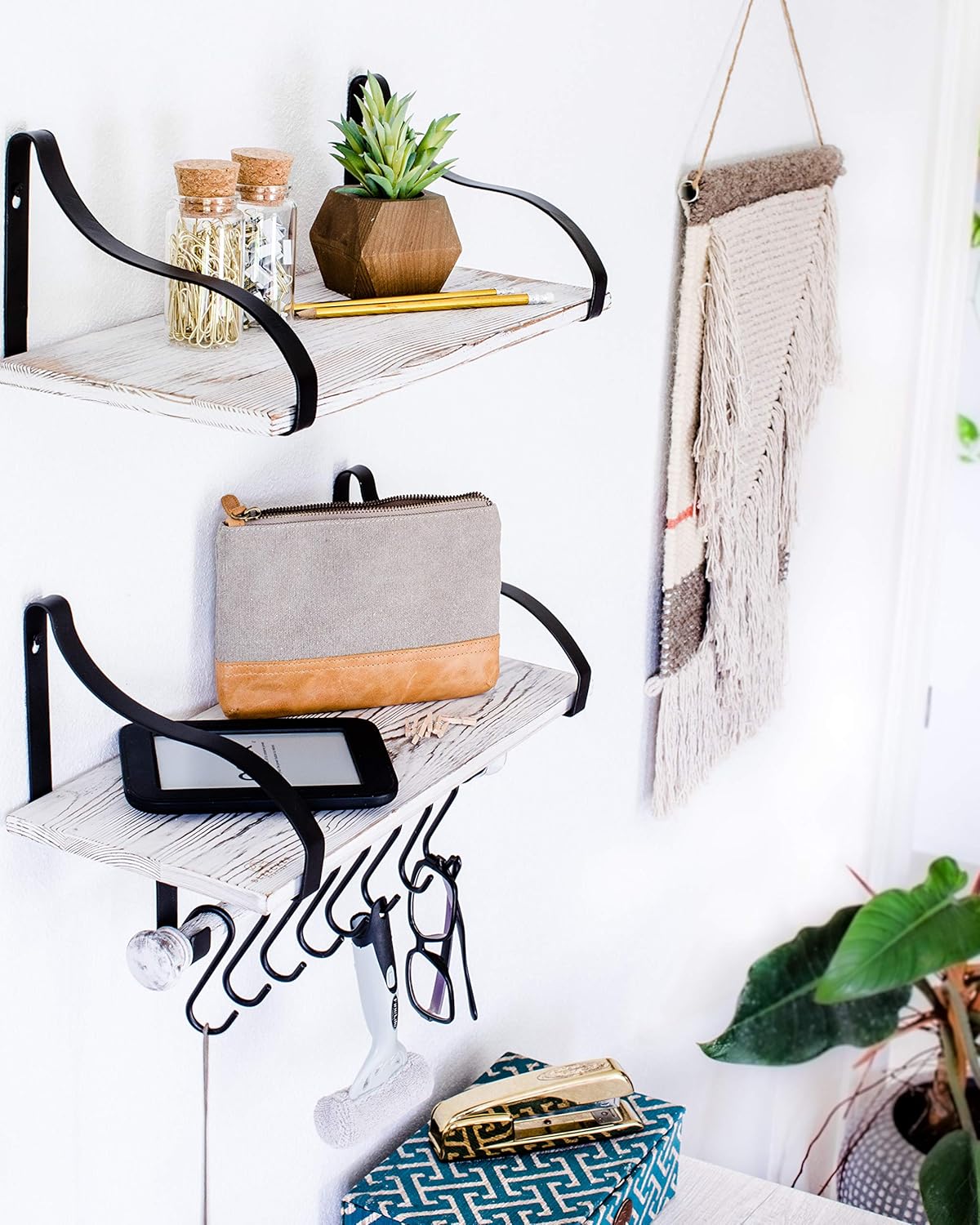 - VERSATILE: One shelf includes a towel bar with 8 removable hooks - use it for hanging coffee mugs, hot pads, cooking utensils, or towels. Use the top of the shelves for spices, canned goods, cook books, soaps, shampoos, home decor - whatever works for you. Perfectly suited for kitchens, bathrooms, children’s nurseries, mudrooms, and laundry rooms - or anywhere you need additional organization.