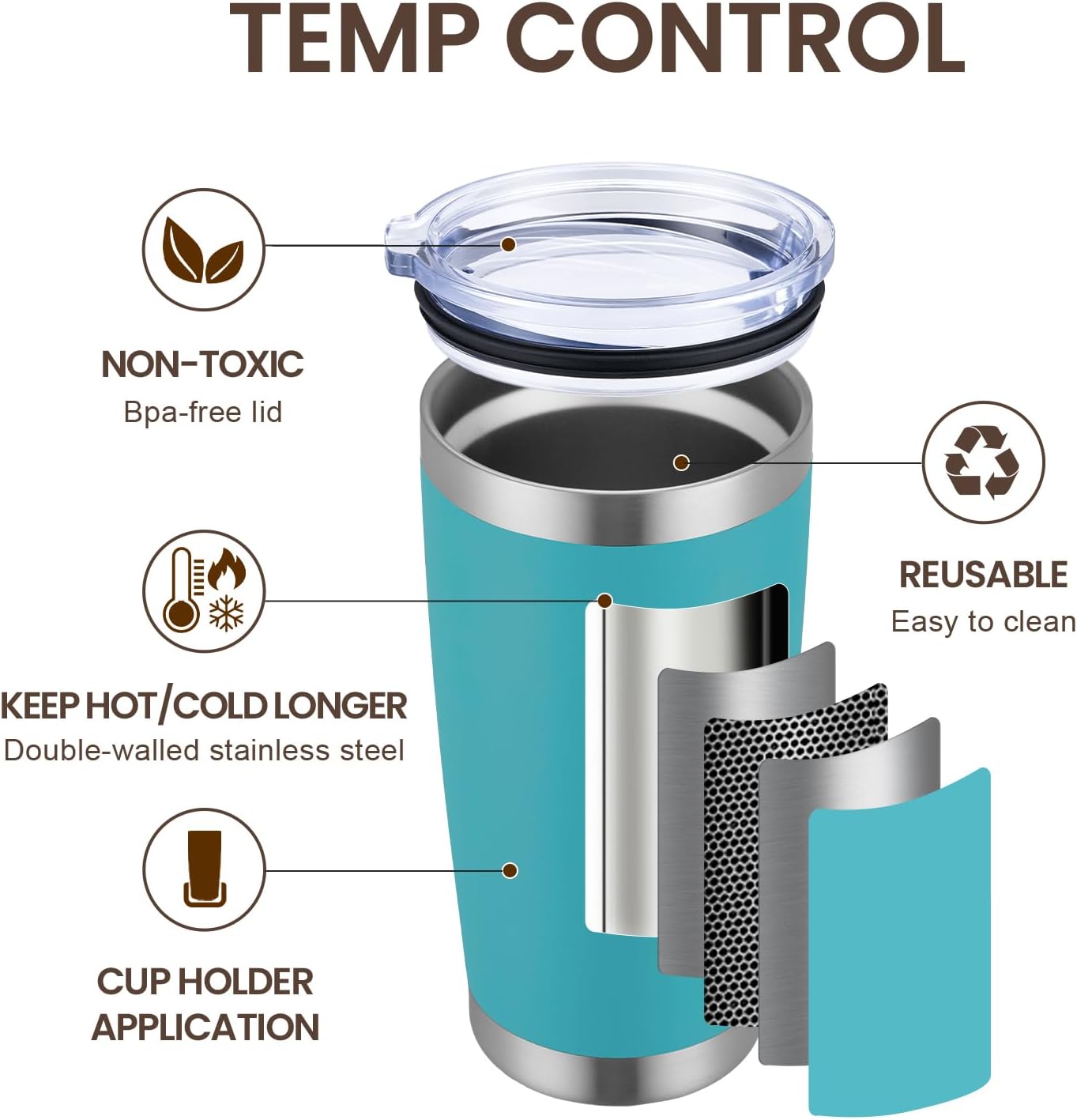 - DURABILITY- 18/8 food grade stainless steel body, No BPA, healthier than plastic cup. The insulated tumbler never sweat due to the Vacuum insulated design. Powder coating on the outside fits more comfortably in your hand, looks good, anti-slip