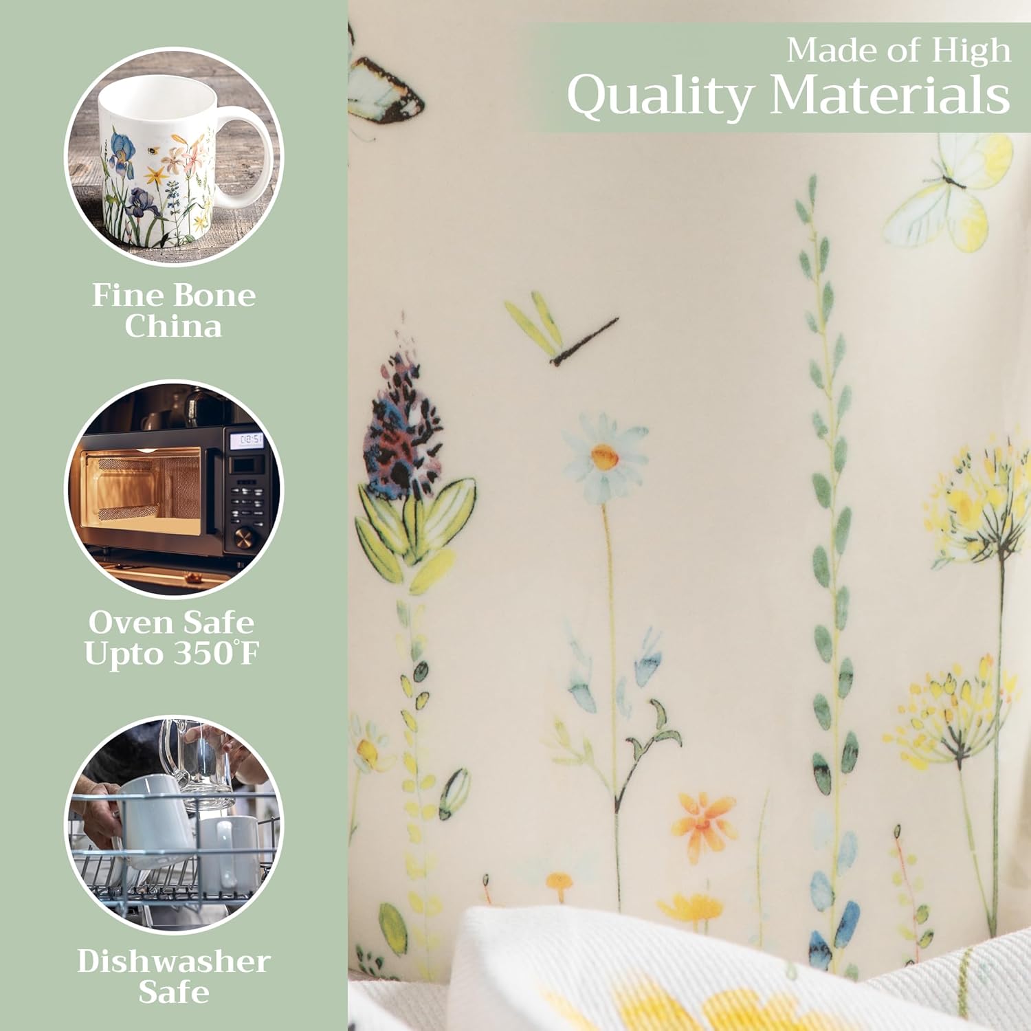 Maison d' Hermine Coffee Mug with Handles Fine Bone China Mugs Pack of One Tea Cups for Hot Beverages Cappuccino Latte Home Restaurant Office Perfect for Gift (Botanical Fresh - Meadow, 12 Ounce)