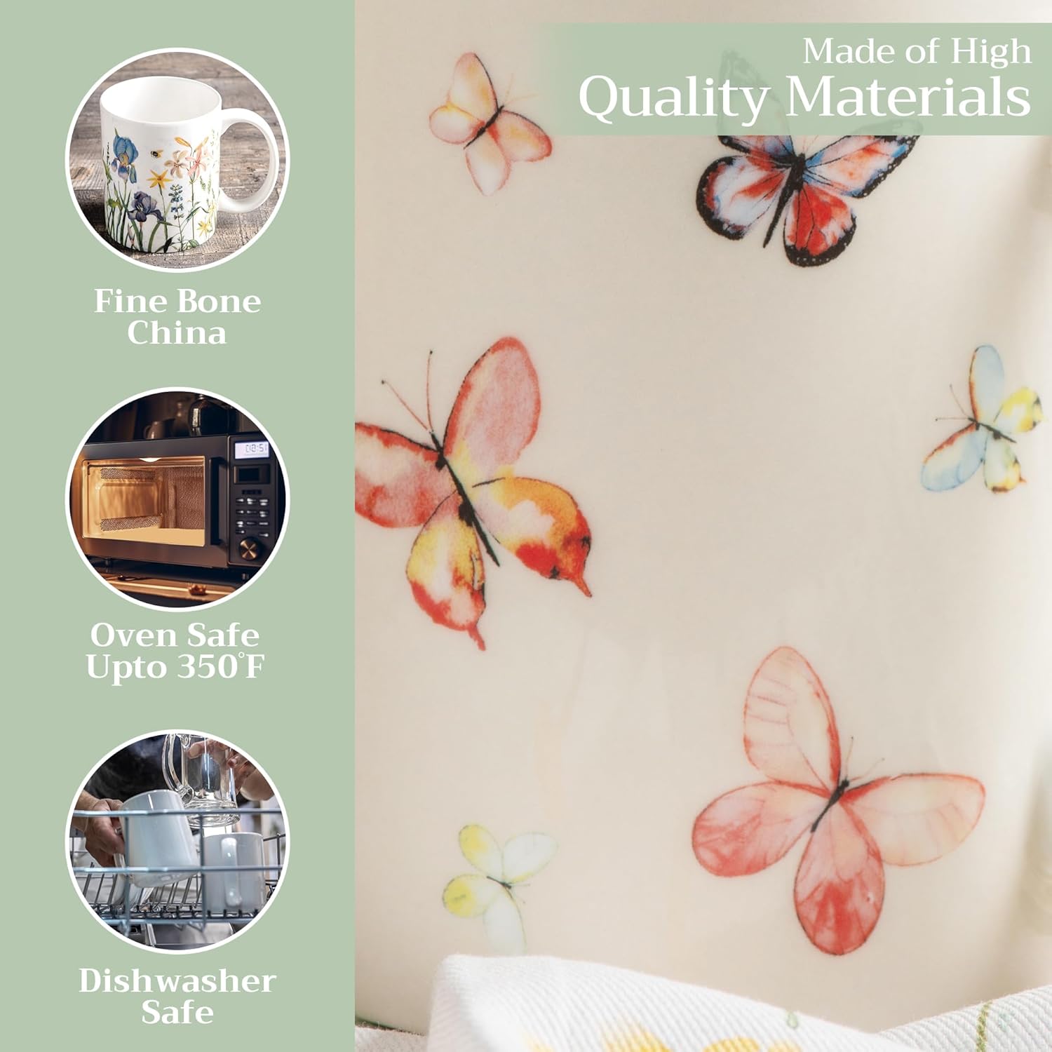 Maison d' Hermine Coffee Mug with Handles Fine Bone China Mugs Pack of One Tea Cups for Hot Beverages Cappuccino Latte Home Restaurant Office Perfect for Gift (Botanical Fresh - Butterflies, 12 Ounce)