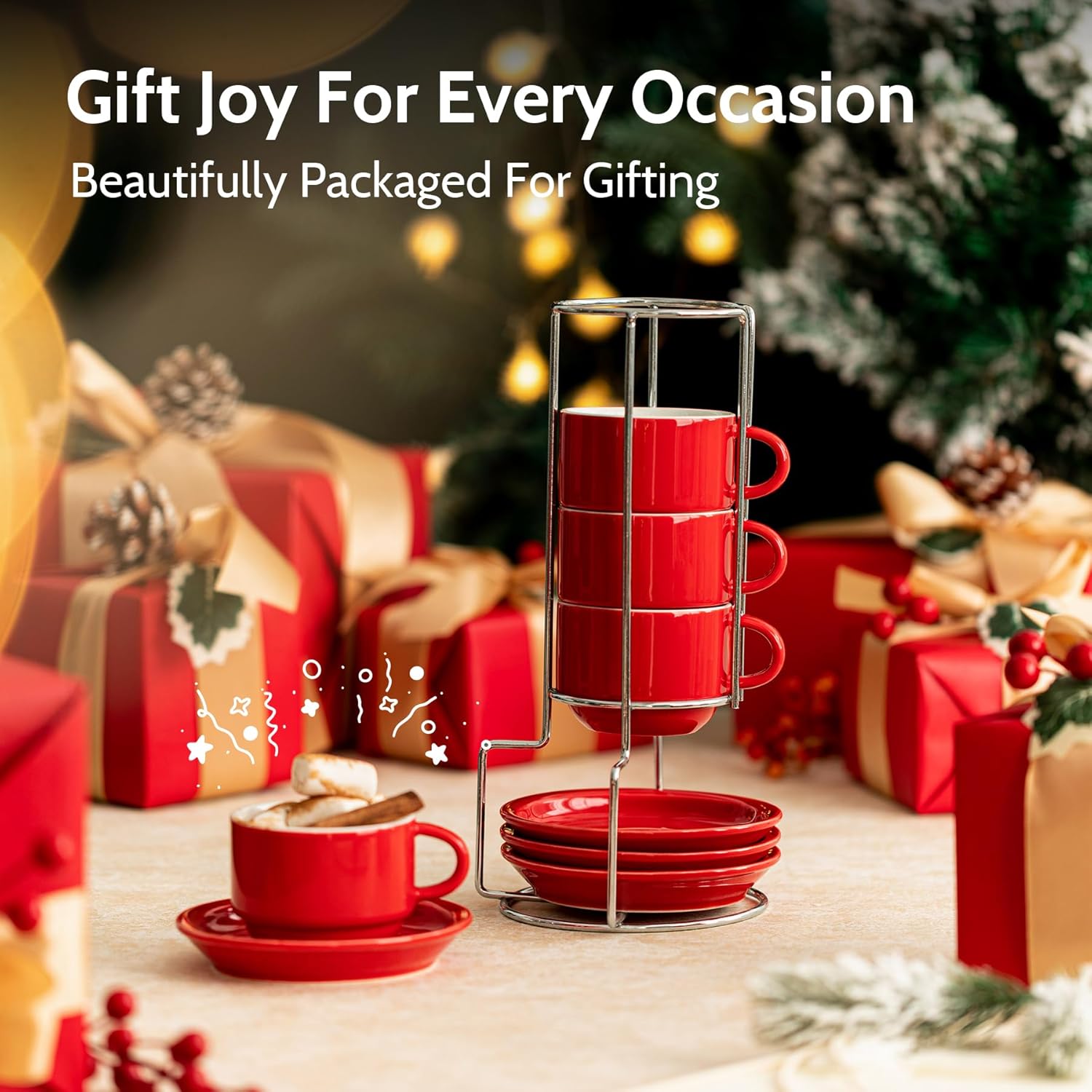 Sweese 8 Ounce Porcelain Stackable Cappuccino Cups with Saucers and Metal Stand - for Specialty Coffee Drinks, Cappuccino, Latte, Americano and Tea - Set of 4, Red