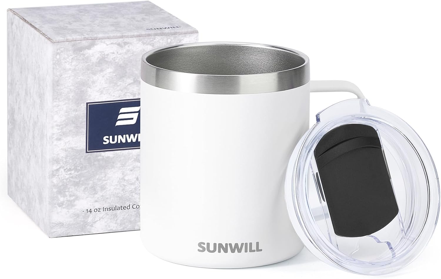 SUNWILL Insulated Coffee Mug with Lid, Travel Tumbler with Handle, 14 oz Stainless Steel Cup for Camping, Office, Home, Powder Coated White