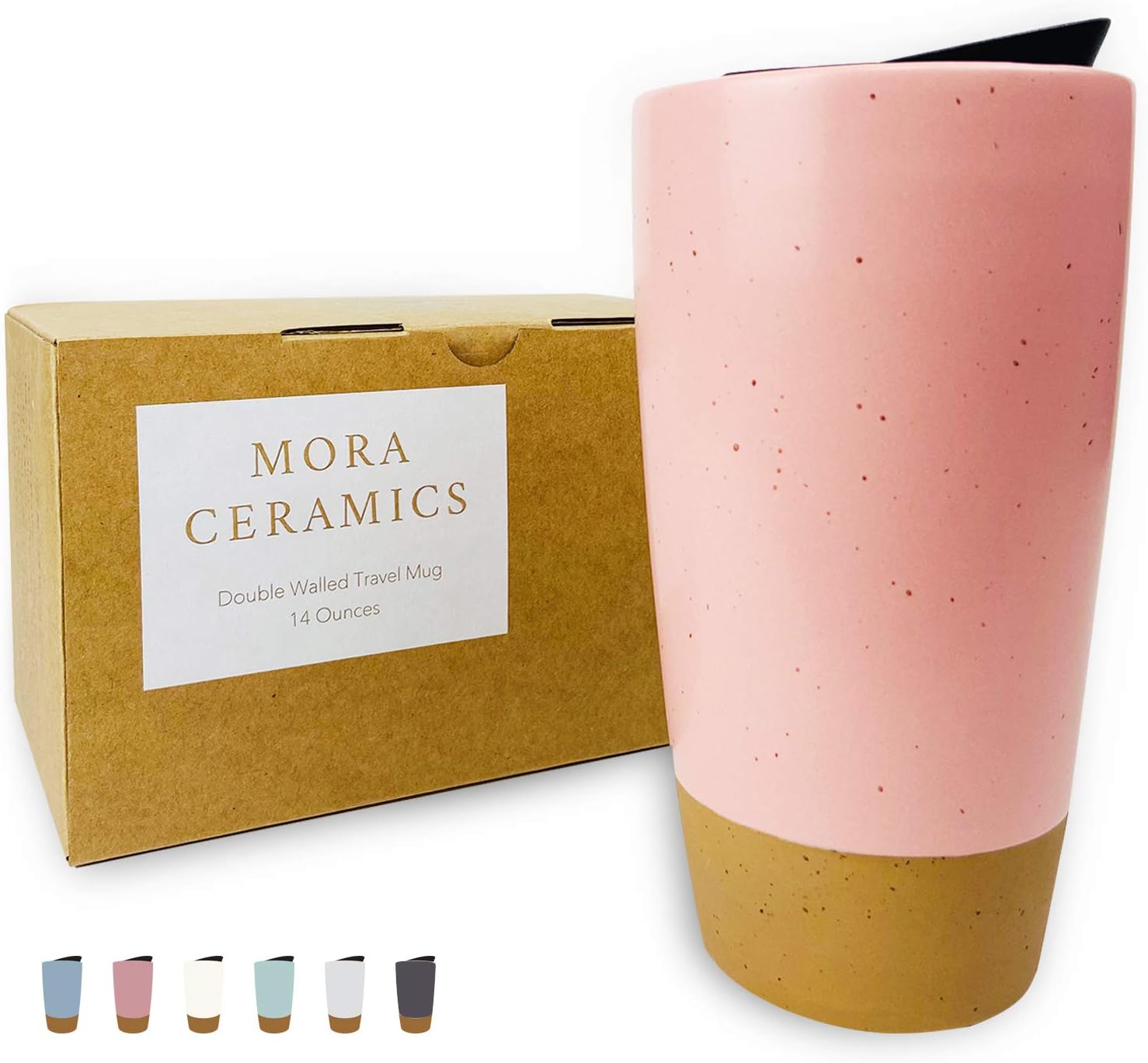 Mora Double Wall Ceramic Coffee Travel Mug with Lid, 14 oz, Portable, Microwave, Dishwasher Safe, Insulated Reusable Tall Cup, Splash Resistant Lid - To Go Tumbler for Car Cup Holder, Pink Salt
