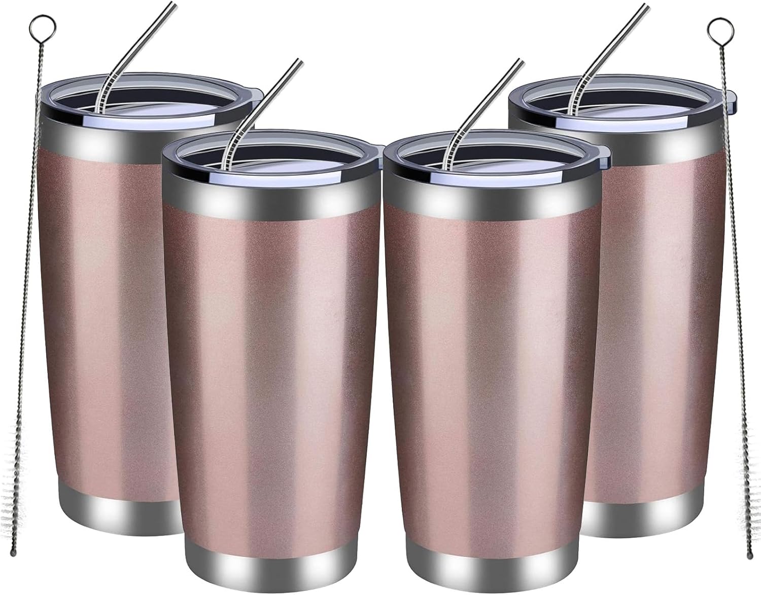 MEWAY 20oz Tumbler 4 Pack Double Wall Vacuum Insulated Travel Mug Bulk, Stainless Steel Tumblers with Lid and Straw, Durable Powder Coated Coffee Cups for Cold & Hot Drinks (Rose Gold, 4)