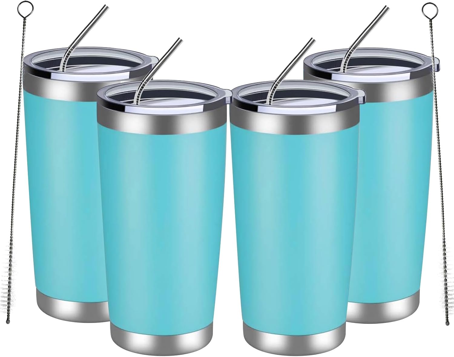 MEWAY 20oz Tumbler 4 Pack Double Wall Vacuum Insulated Travel Mug Bulk, Stainless Steel Tumblers with Lid and Straw, Durable Powder Coated Coffee Cups for Cold & Hot Drinks (Light Blue, 4)