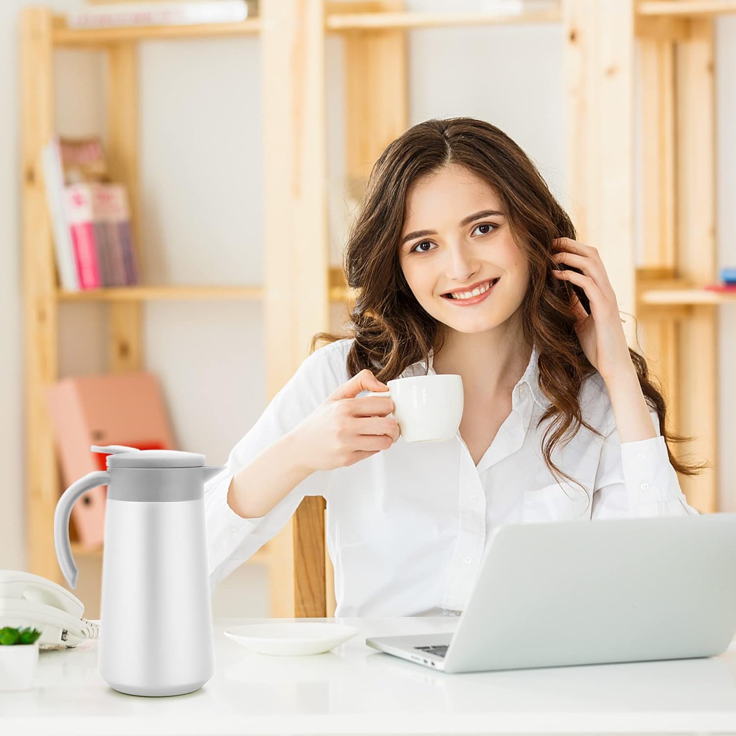 - SINGLE HAND POURING, USER FRIENDLY: Pour spout opens easily when press the push button, making one-handed pouring of this thermal pot simple. It's safe to touch the coffee flask exterior body either it is a hot or cold beverage inside as the temperature is locked in and the carafe body stays cool.