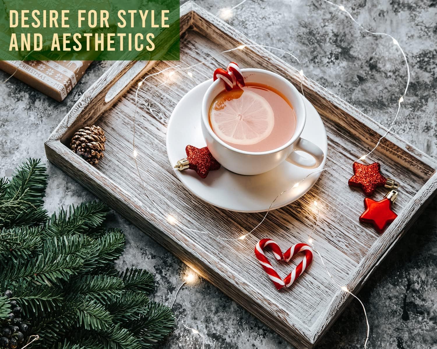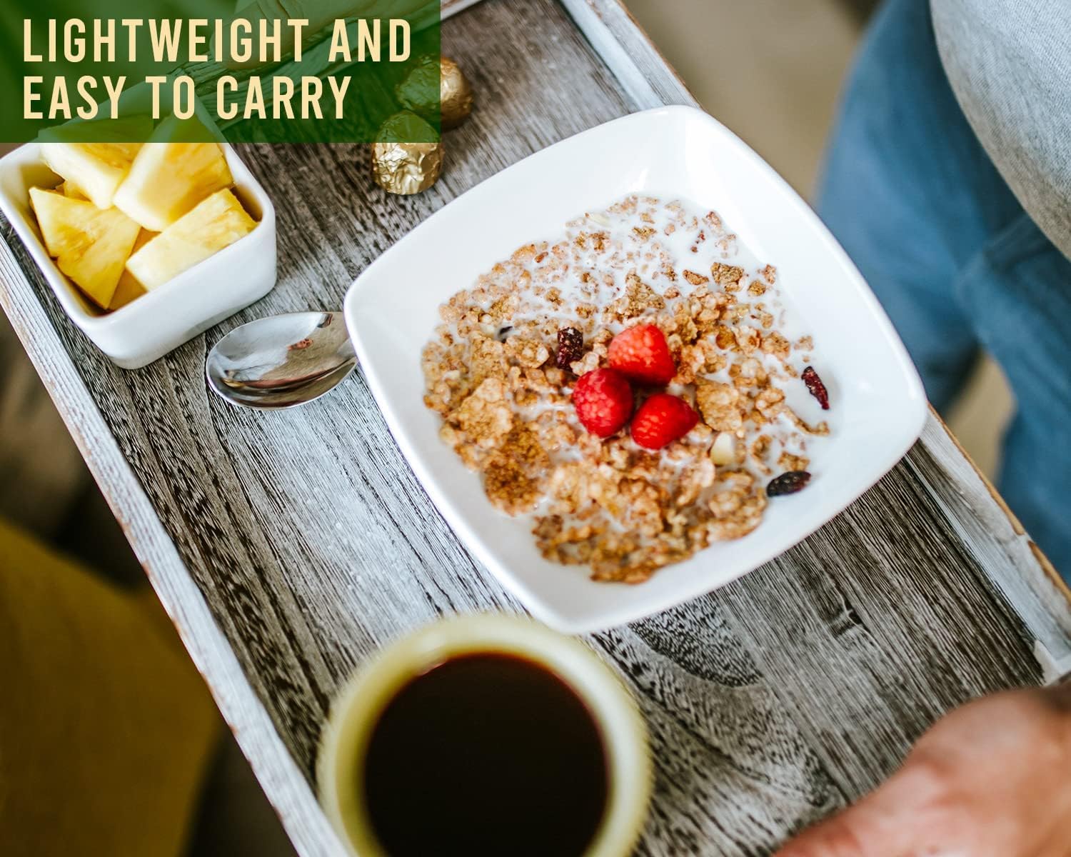 - Farmhouse wooden serving trays: Use them to serve drinks, breakfast in bed, coffee at hotels, bars or coffee shops. Made from natural paulownia wood, these durable serving trays will help you do the tasks you need while also saving nature by being biodegradable.