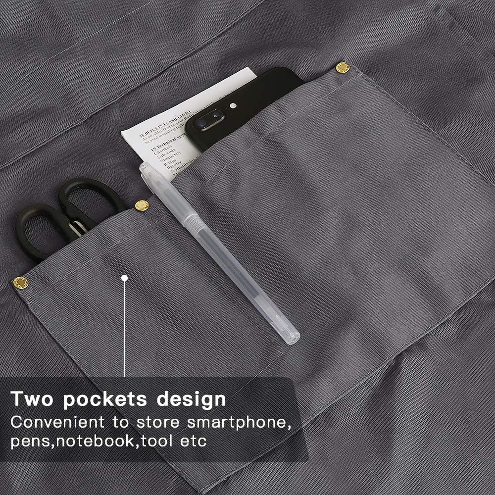 - Bib apron comes with two pockets,perfect to store cellphones or pens, notebooks or bigger items, and a utility loop to hang tools from