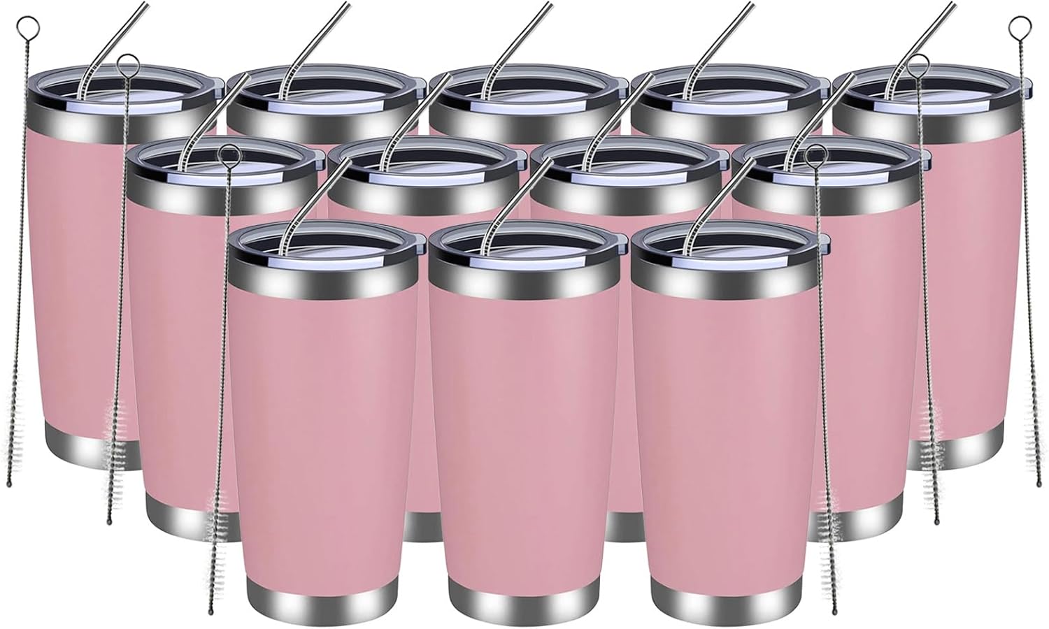 MEWAY 20oz Tumbler 12 Pack Double Wall Vacuum Insulated Travel Mug Bulk, Stainless Steel Tumblers with Lid and Straw, Durable Powder Coated Coffee Cups for Cold & Hot Drinks (Pink, 12)