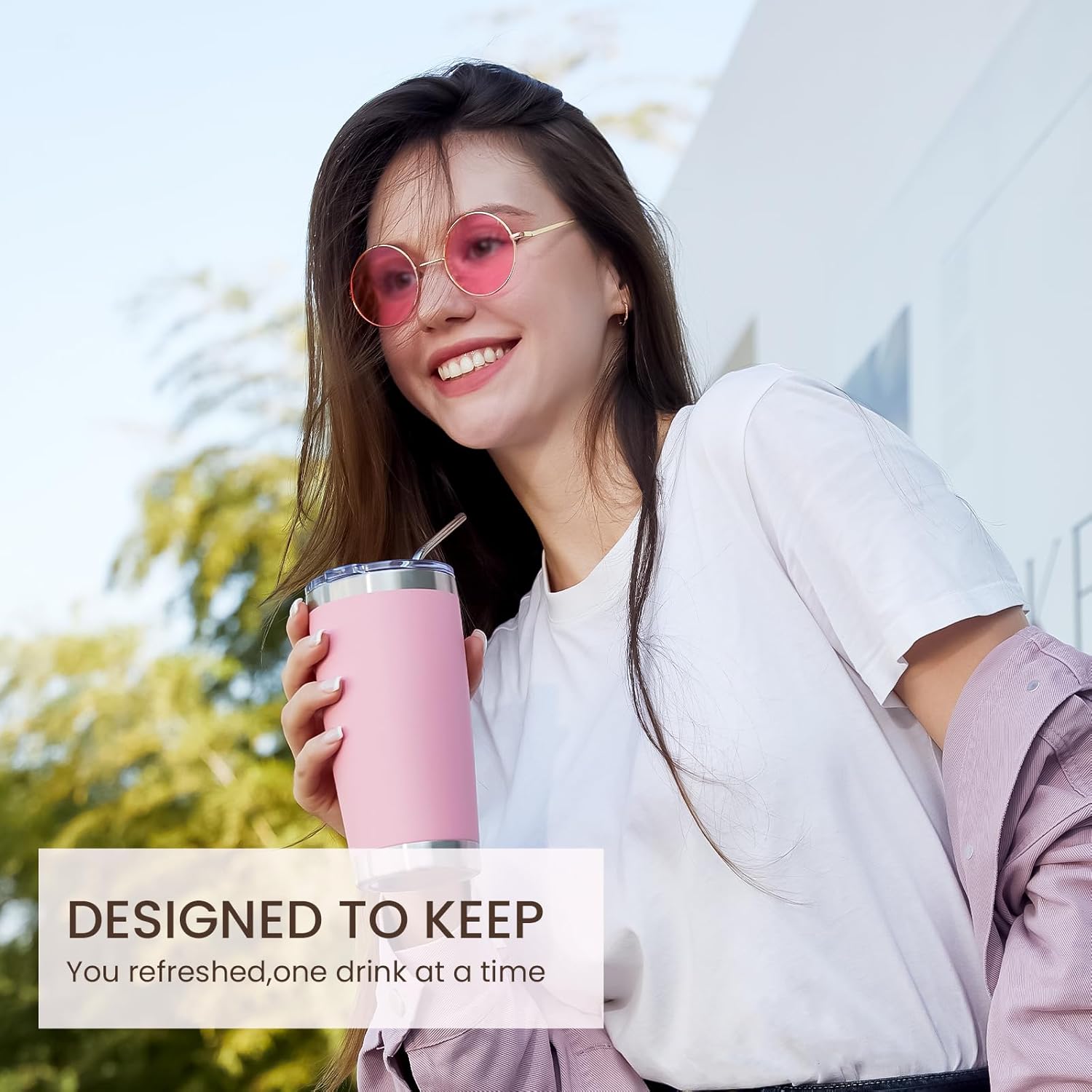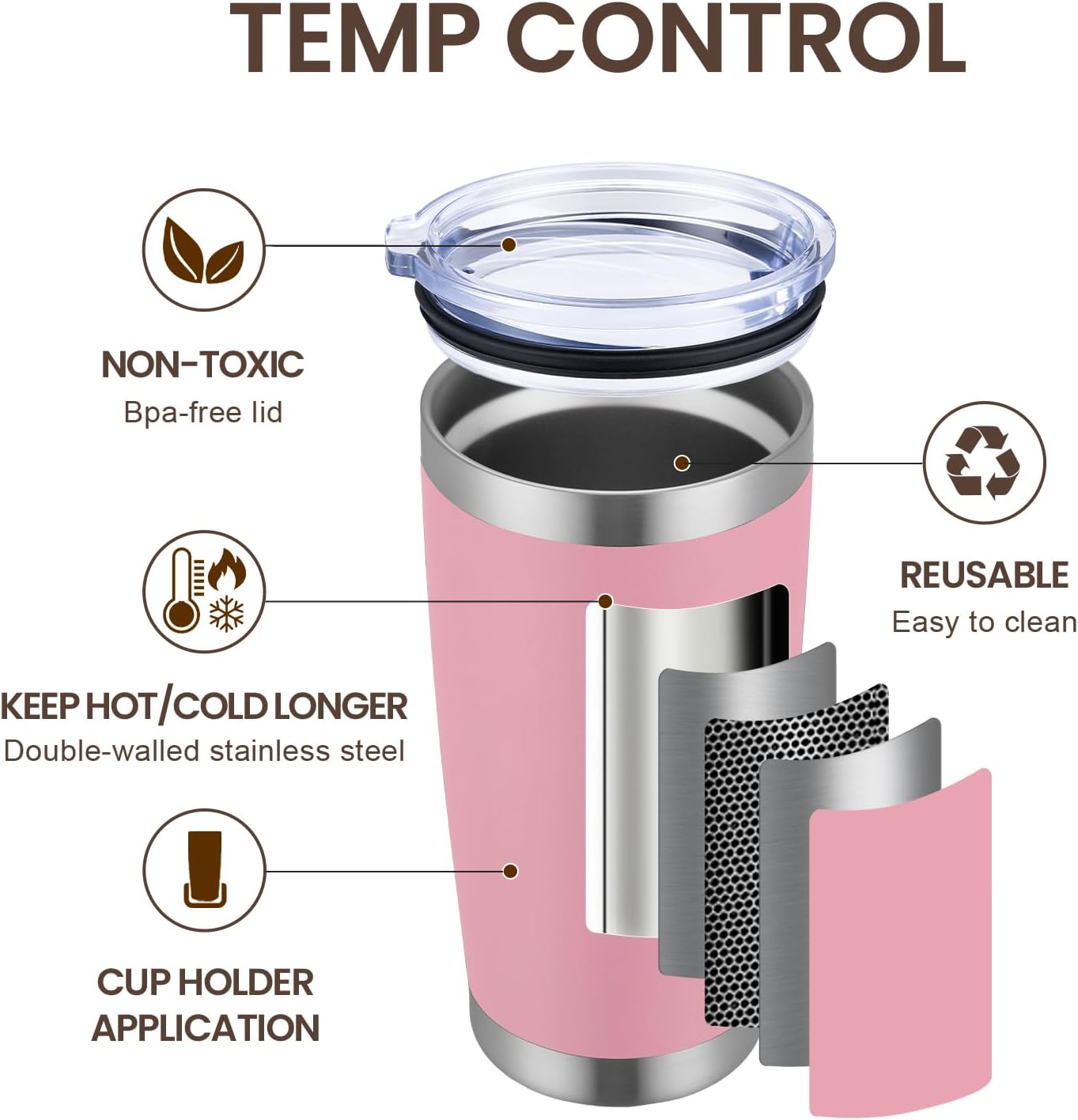 - DURABILITY- 18/8 food grade stainless steel body, No BPA, healthier than plastic cup. The insulated tumbler never sweat due to the Vacuum insulated design. Powder coating on the outside fits more comfortably in your hand, looks good, anti-slip