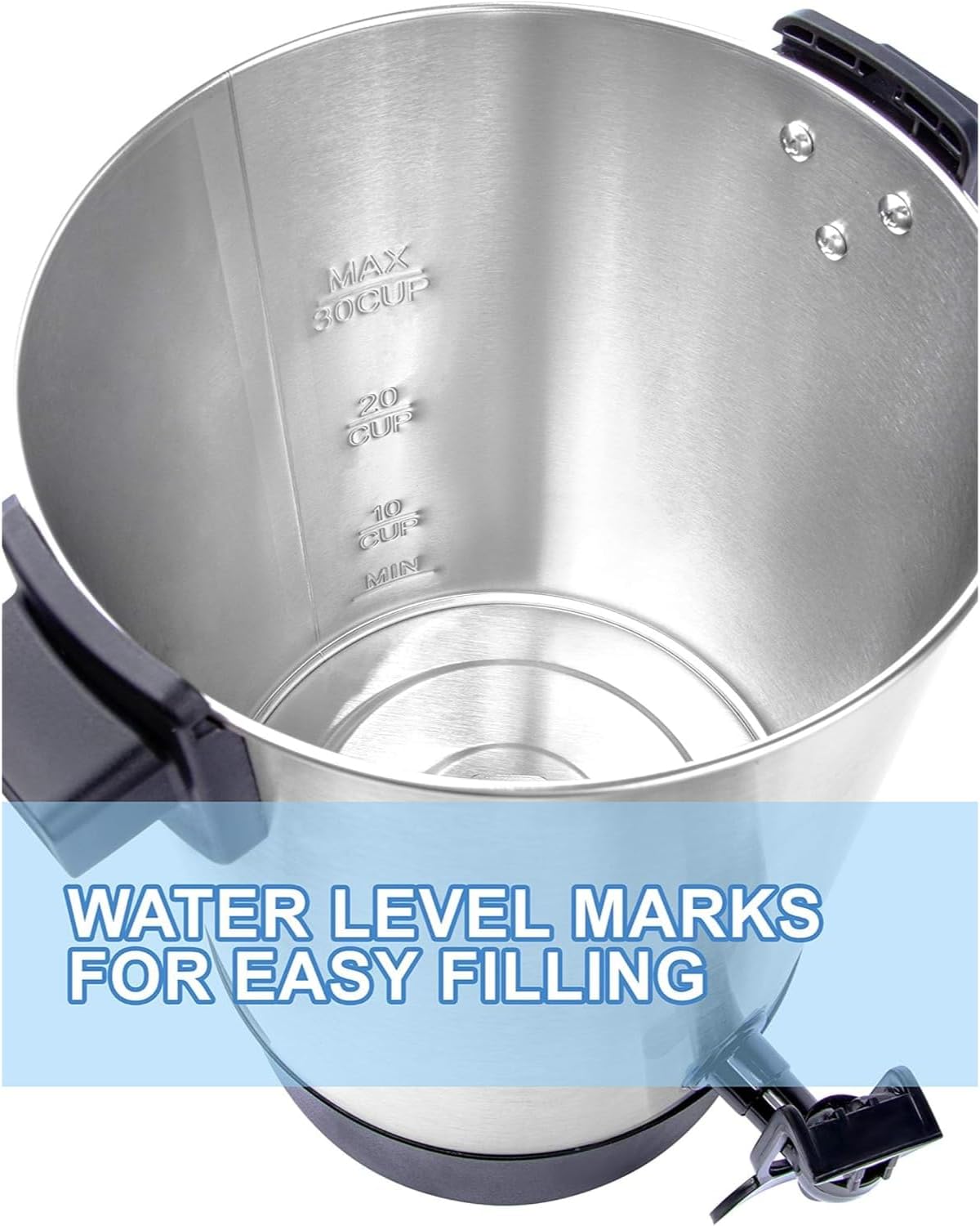 - ✪ COMMERCIAL USE--Brew 30 ~40cups (3.5 Liter / 1.2 Gallon) in 30 minutes. Built for catering service, ideal for large families, caterers, restaurants, churches, schools, health care facilities, offices and shops.