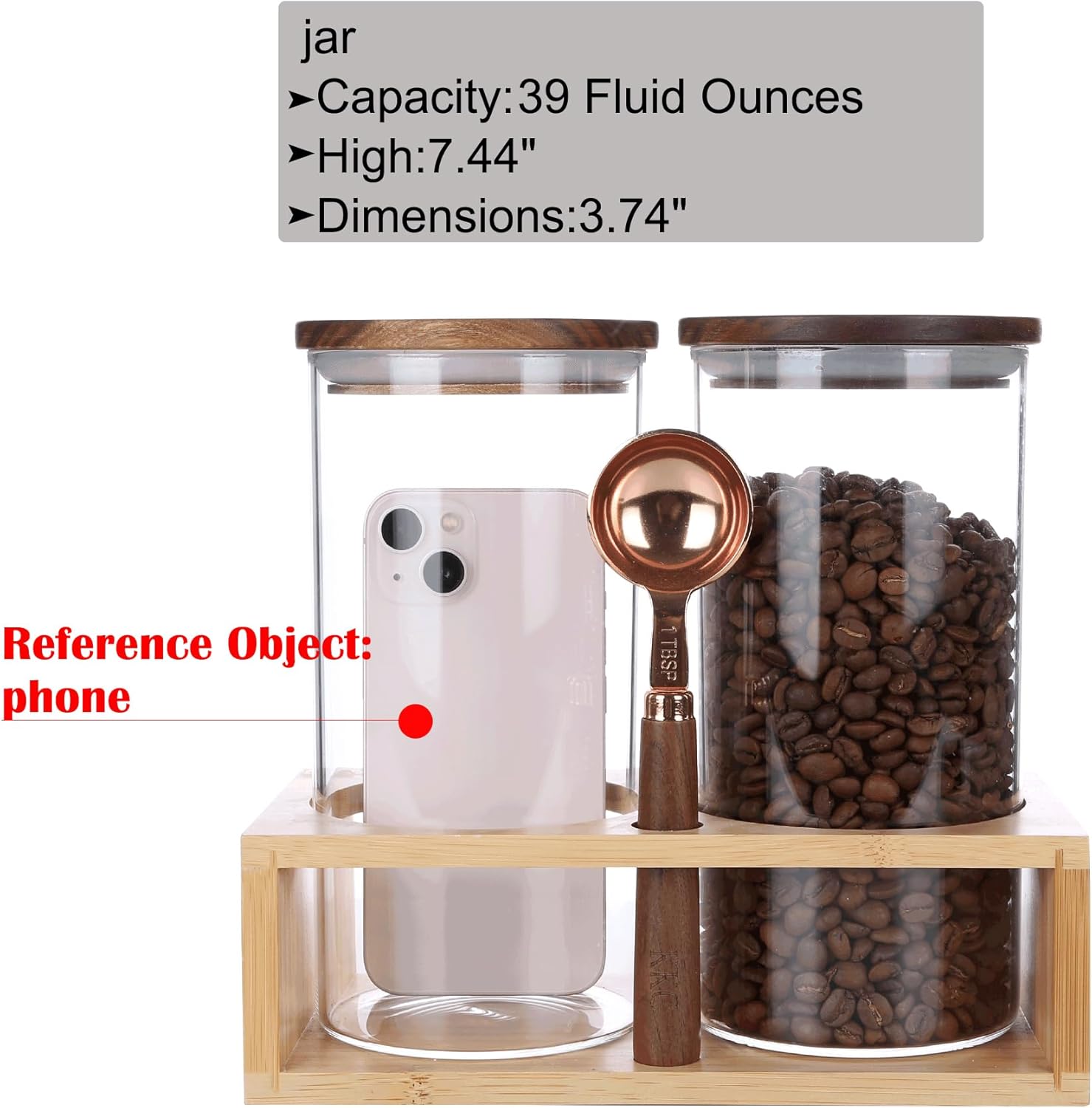 - Complete Set Includes:2 sealed glass jars(height 7.44" x diameter 3.74",capacity:39 floz/1150ml),1 wooden handle scoop(1 TBSP) and 1 bamboo rack(8.66" x 4.5" x 2.76",L x W x H),label stickers.