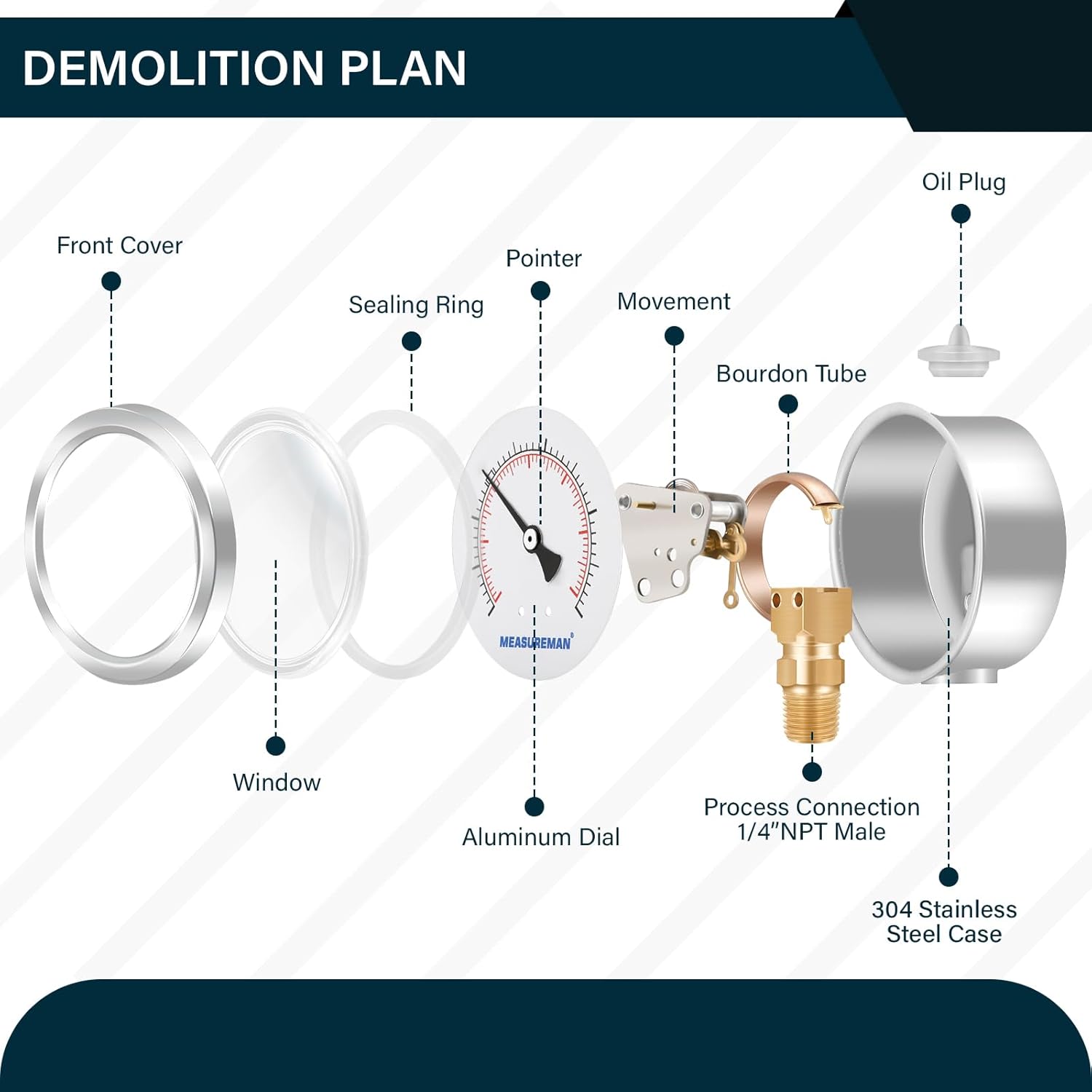 - 2-1/2" dial size, 1/4"NPT lower mount,