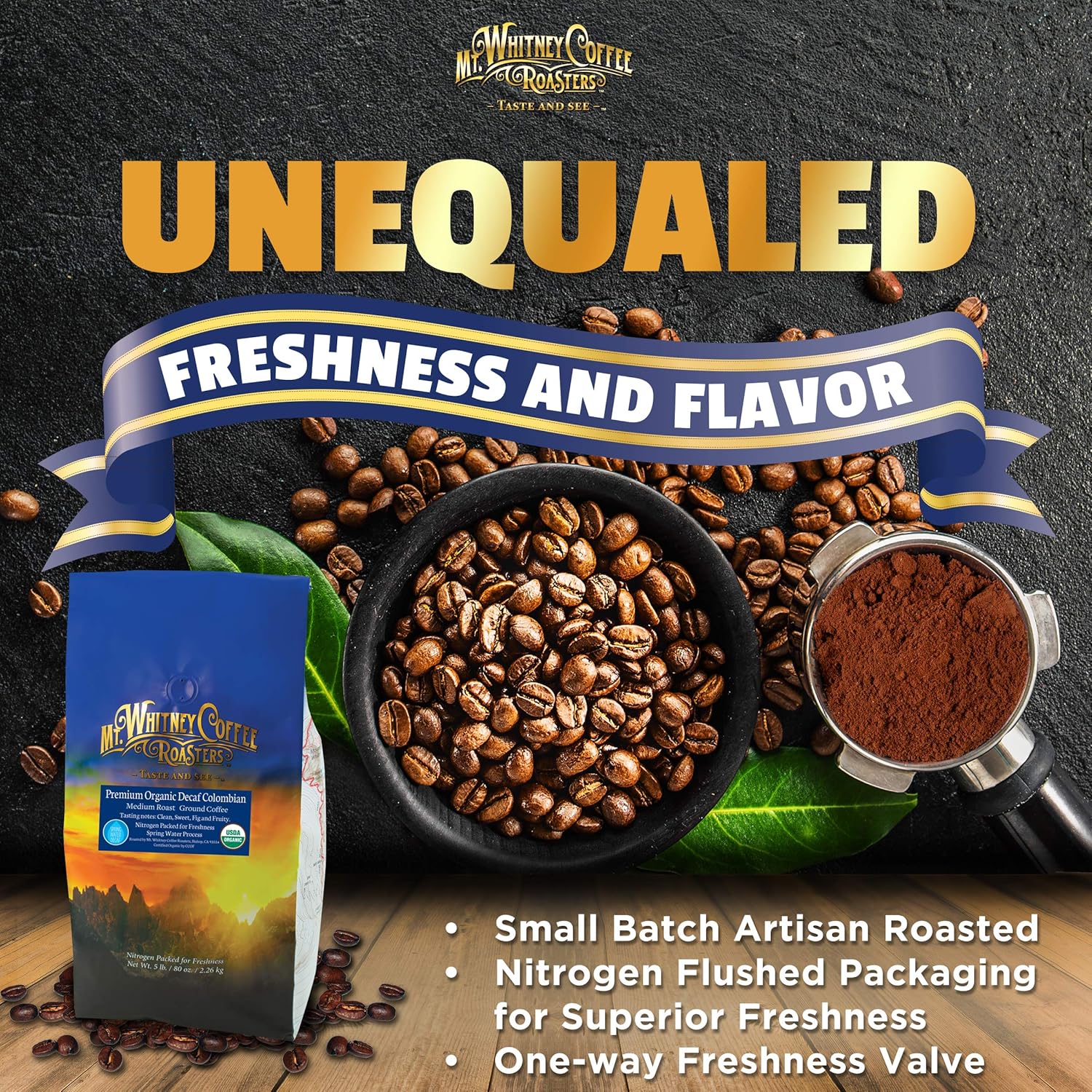 Mt. Whitney Premium Organic Spring Water Colombian, Medium Dark Roast, Low Acid Decaf Coffee (Ground, 5 Lb)