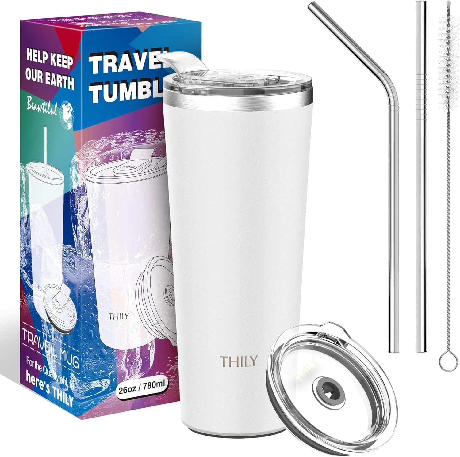 THILY Vacuum Insulated Tumbler Stainless Steel 26 oz Coffee Cup with 2 Lids and Straws, Powder Coated Travel Mug, Keeps Ice Drinks Cold, White