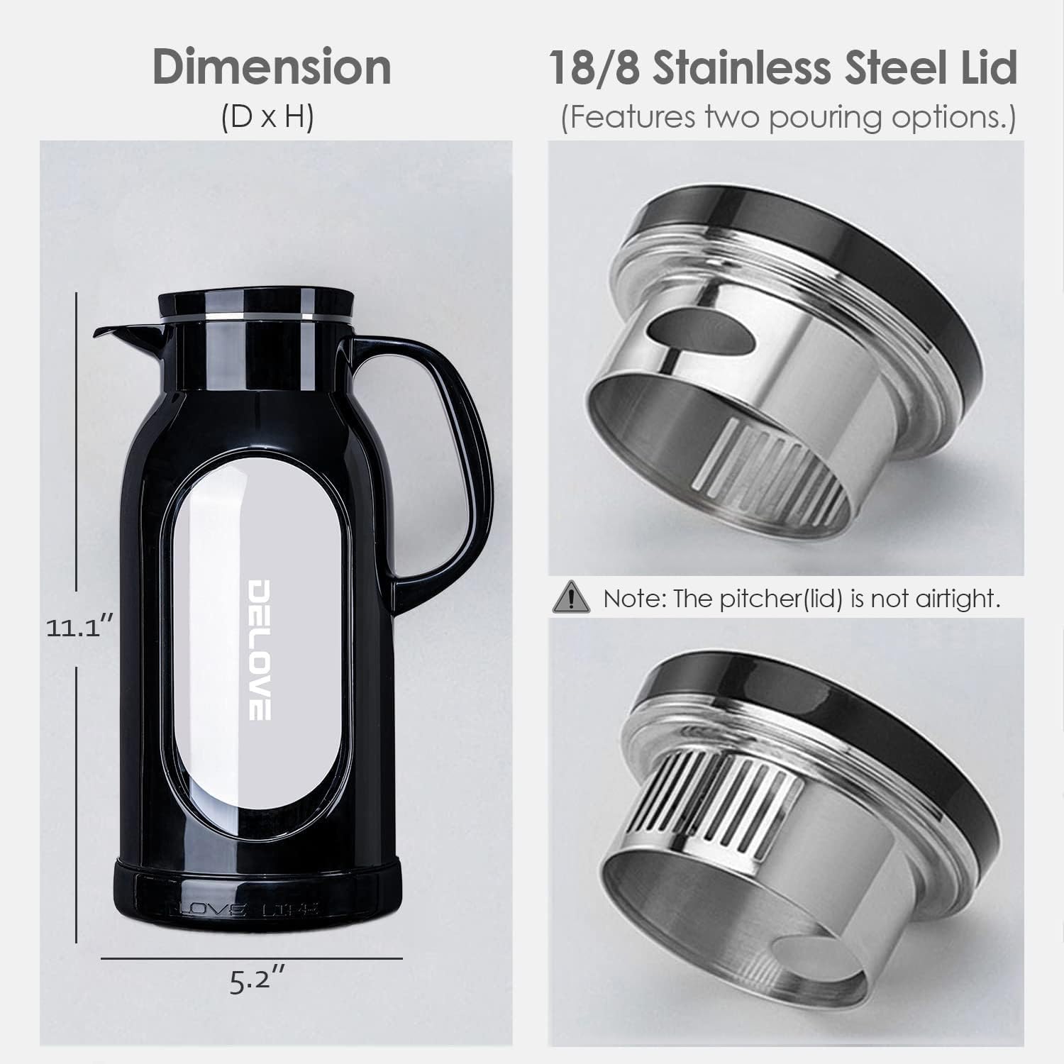 Delove 68 oz/2 Liter Glass Pitcher with Shatterproof Shell - Heat Resistant Glass Liner - Stainless Steel Lid - Carafe & Jug for Iced Tea,Hot/Cold Water,Homemade Juice Beverages (Black)