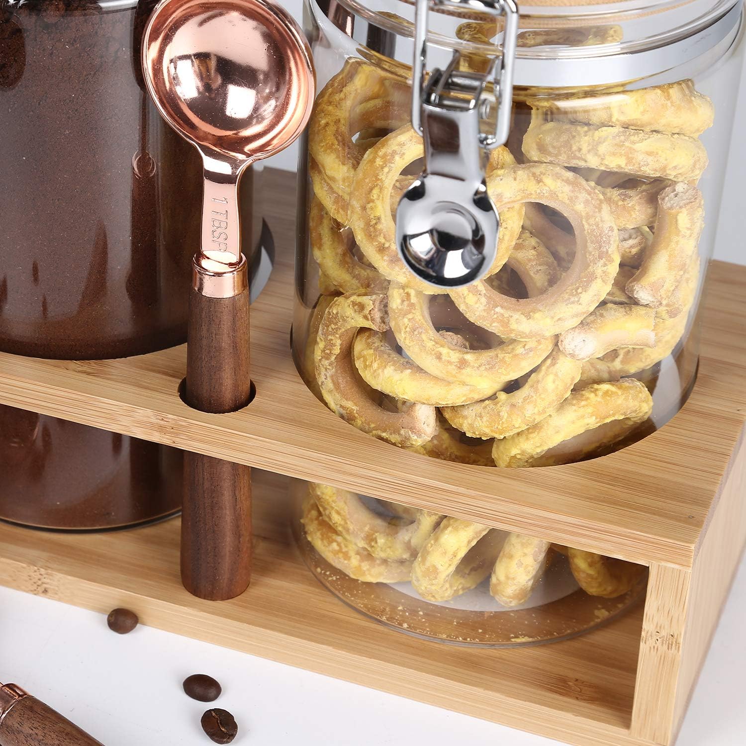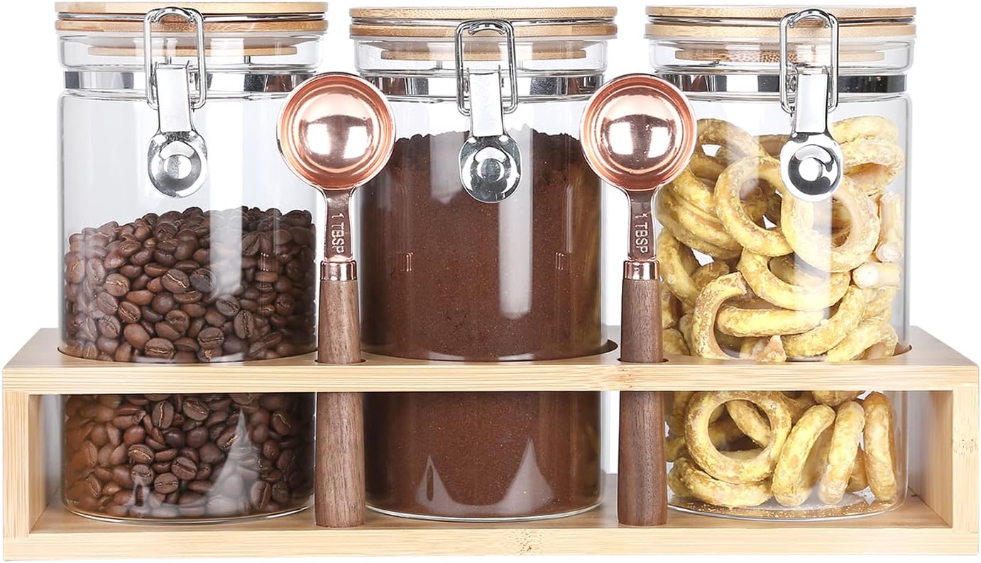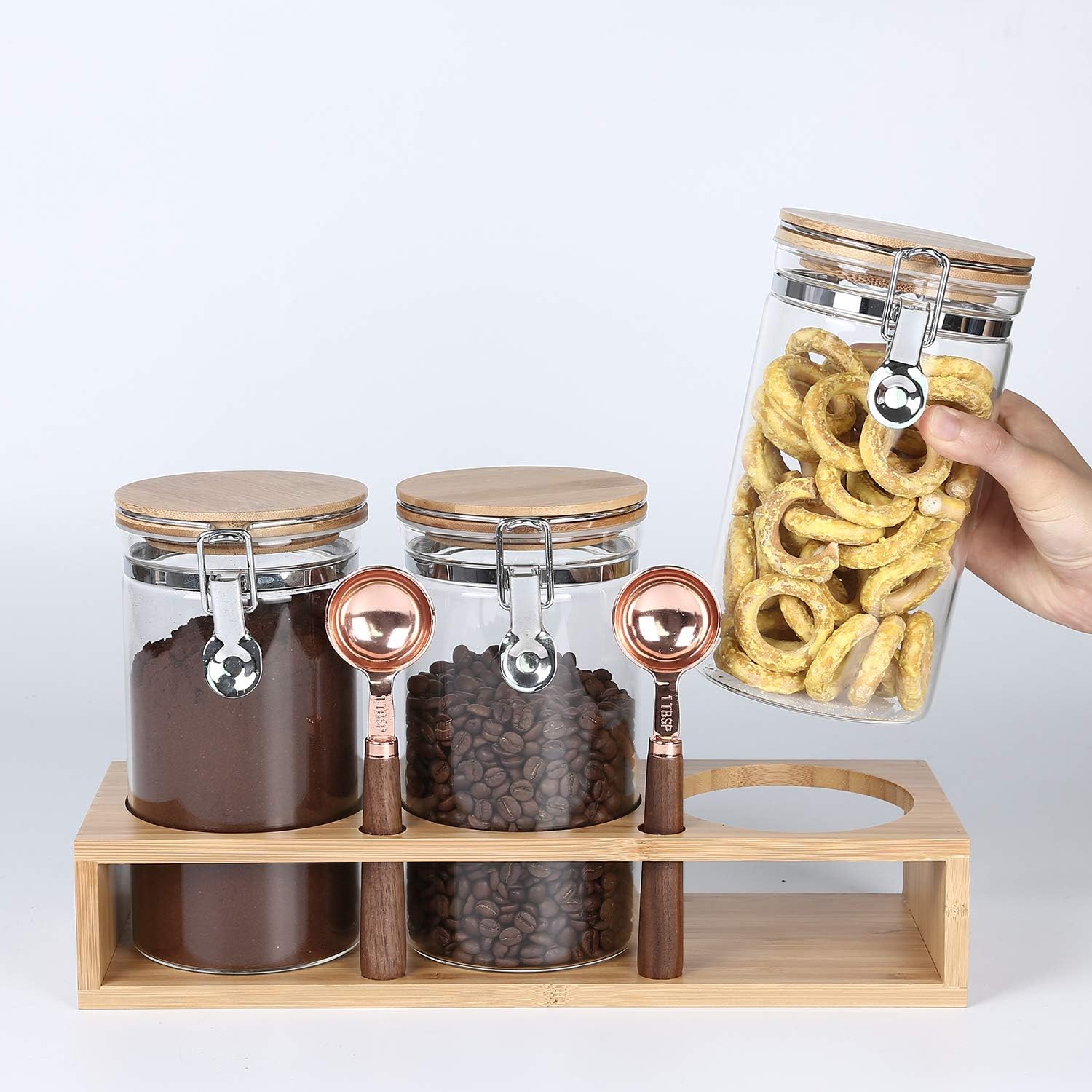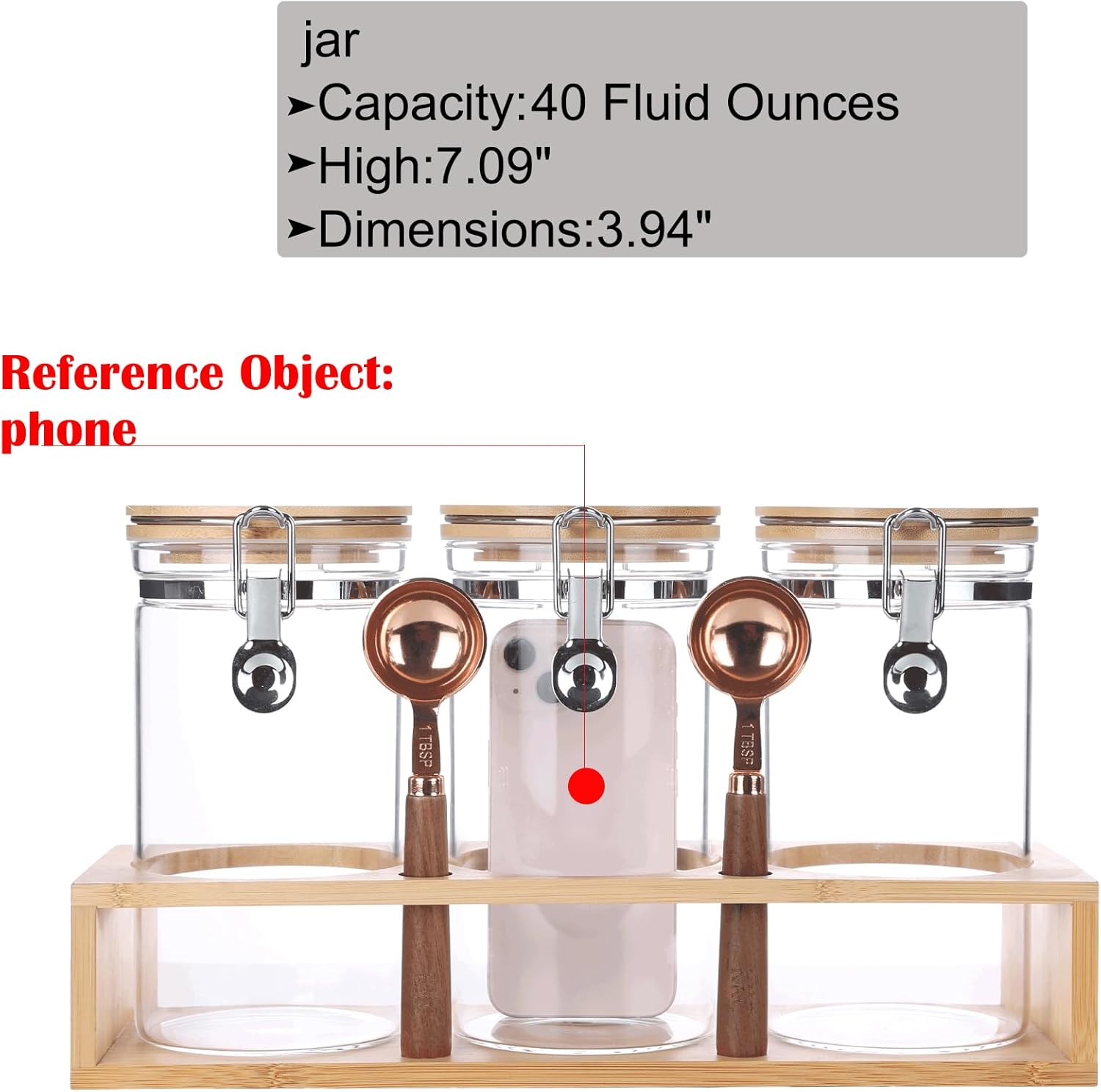 - Complete Set Includes:3 glass sealed jars (Height 7" x Diameter 3.9",Capacity:40floz/1200ml),2 wooden handle scoops(1 TBSP) and 1 bamboo rack(14" x 4.72" x 2.76",L x W x H) and label stickers.