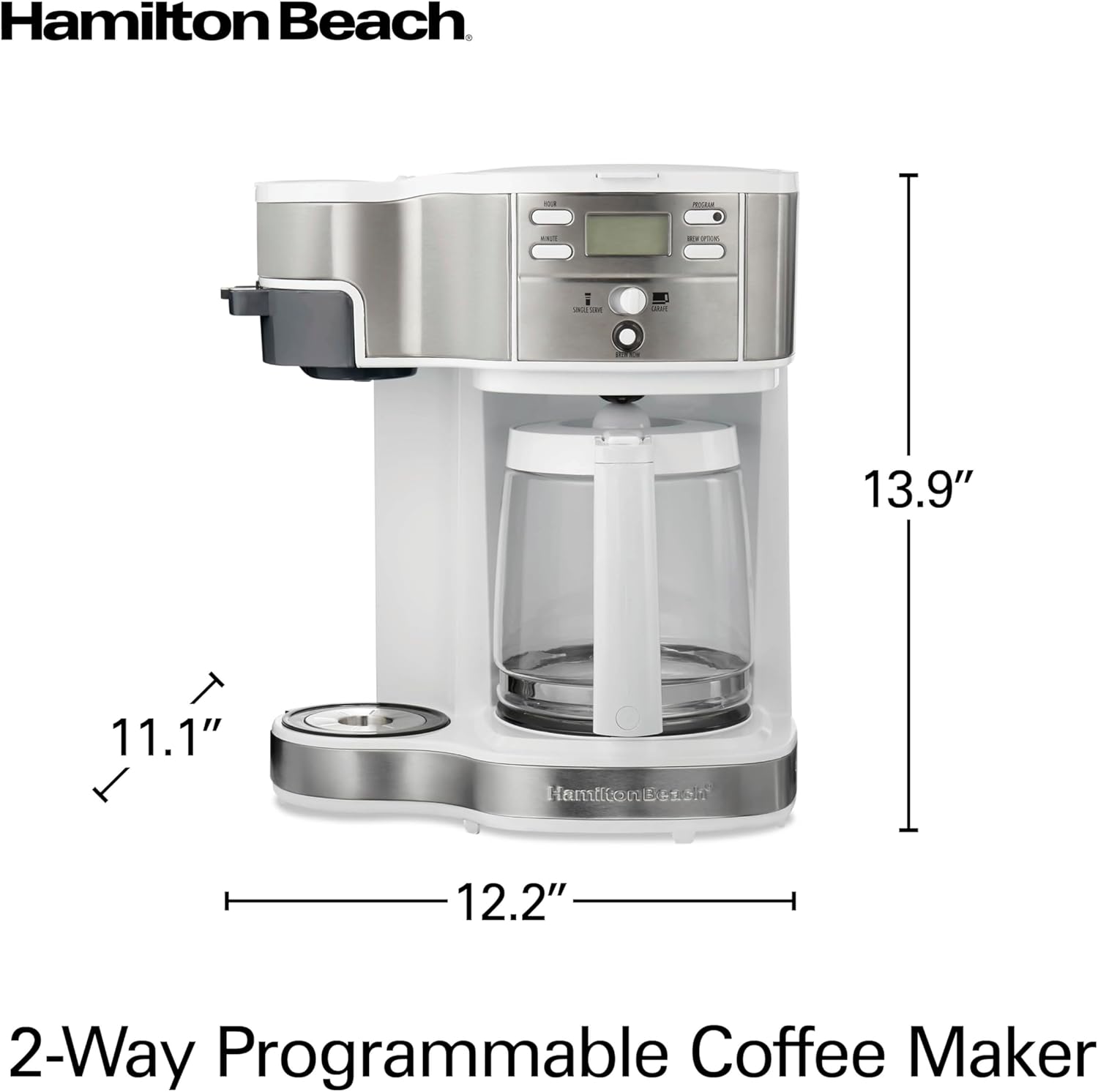 Hamilton Beach 49933 2-Way 12 Cup Programmable Drip Coffee Maker & Single Serve Machine, Glass Carafe, Auto Pause and Pour, White