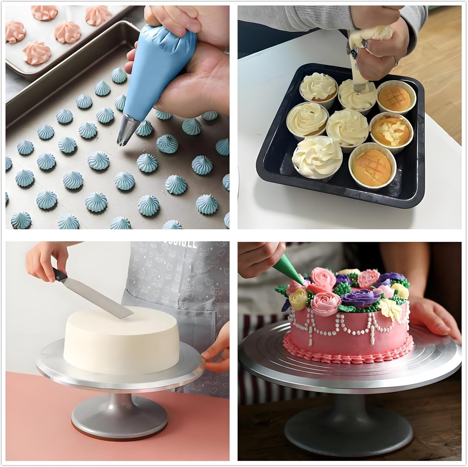 - 【Cake Decorating Kit 】: The Cake Turntable Set of 237 included 12 Inch Aluminium Alloy Rotating Cake Stand,1 Cake Leveler,24 Numbered Icing Tips(Small) & Pattern Chart,2 Couplers,1 Straight Spatula,1 Angled Spatula,3 Plastic Comb Scrapers,2 Bags Ties,1 Cleaning Brush,100 Disposable Pastry Bags,50 Paper Cupcake Liners,50 Cake Flags.