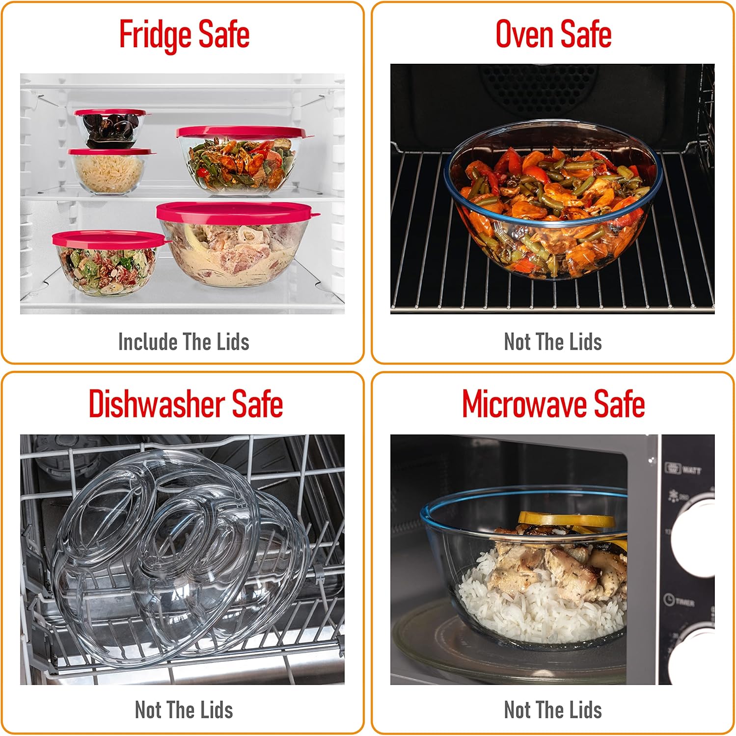 - SPACE-SAVING STACKABLE glass mixing bowls set will save space in your kitchen. The round glass bowls with lids neatly nest inside each other, allowing you to store them in cupboards.
