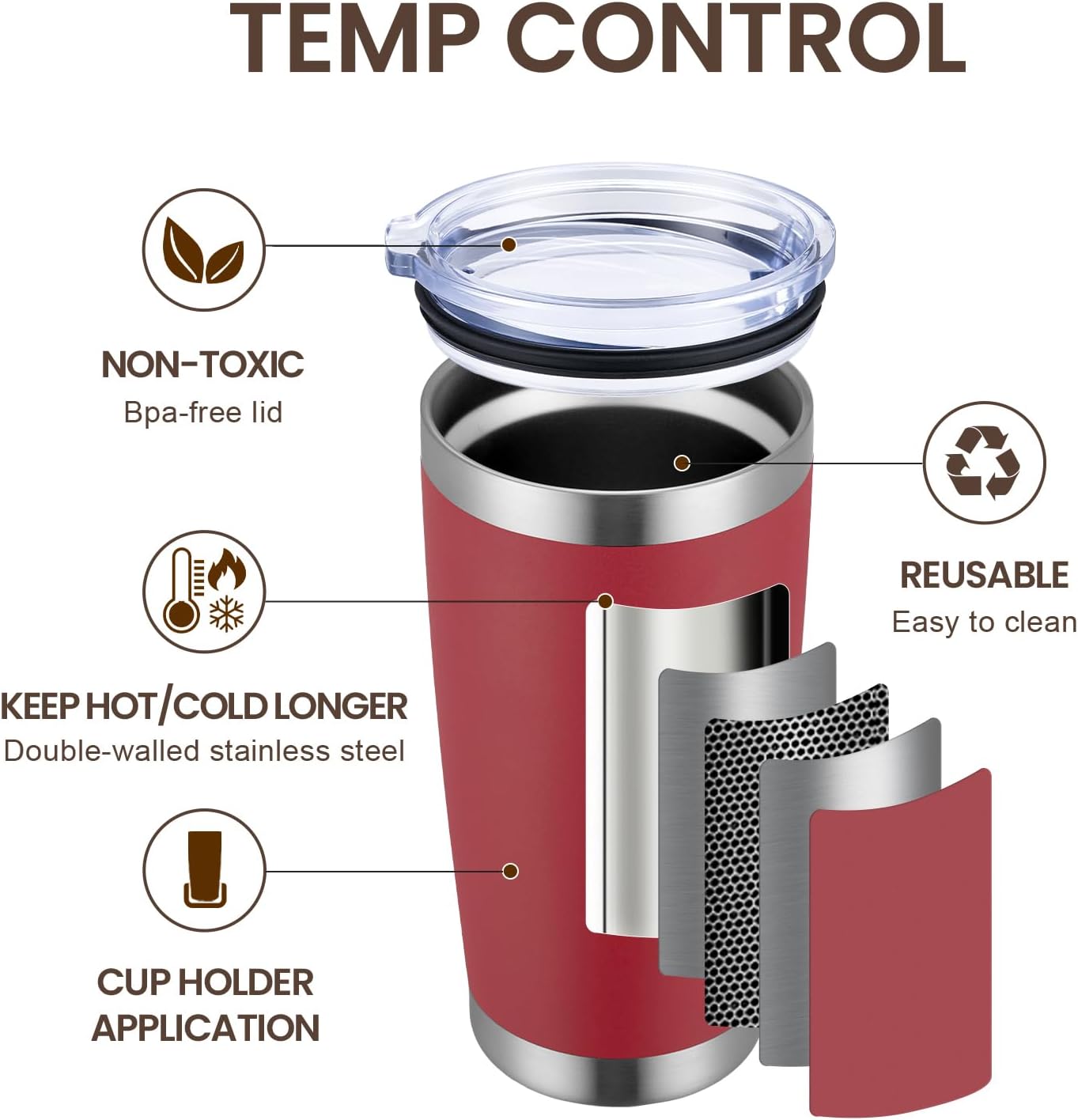 - DURABILITY- 18/8 food grade stainless steel body, No BPA, healthier than plastic cup. The insulated tumbler never sweat due to the Vacuum insulated design. Powder coating on the outside fits more comfortably in your hand, looks good, anti-slip